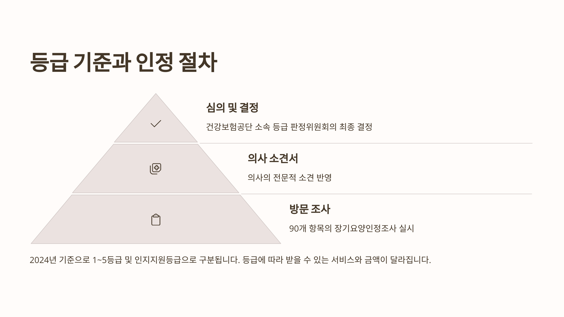 이 조사를 통해 거동 여부, 인지 기능, 질병 상태 등을 점수화해서 등급이 결정돼요.