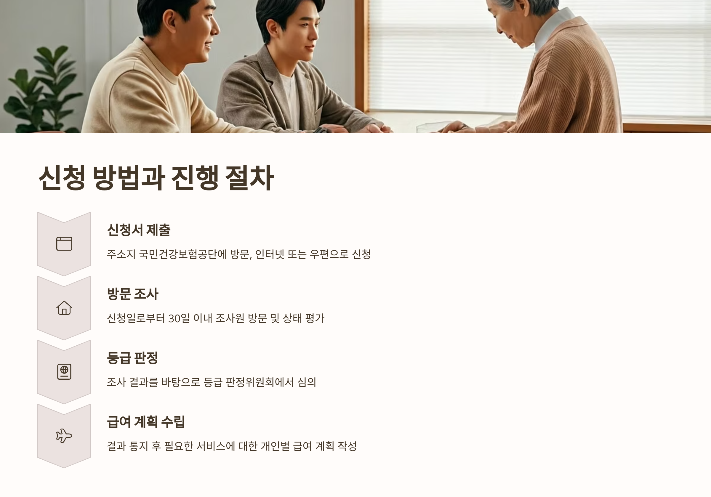 신청 후 30일 이내에 조사원이 방문해서 **장기요양 인정조사**를 진행하고, 그 결과를 바탕으로 등급판정위원회가 심의해 등급을 결정해요.