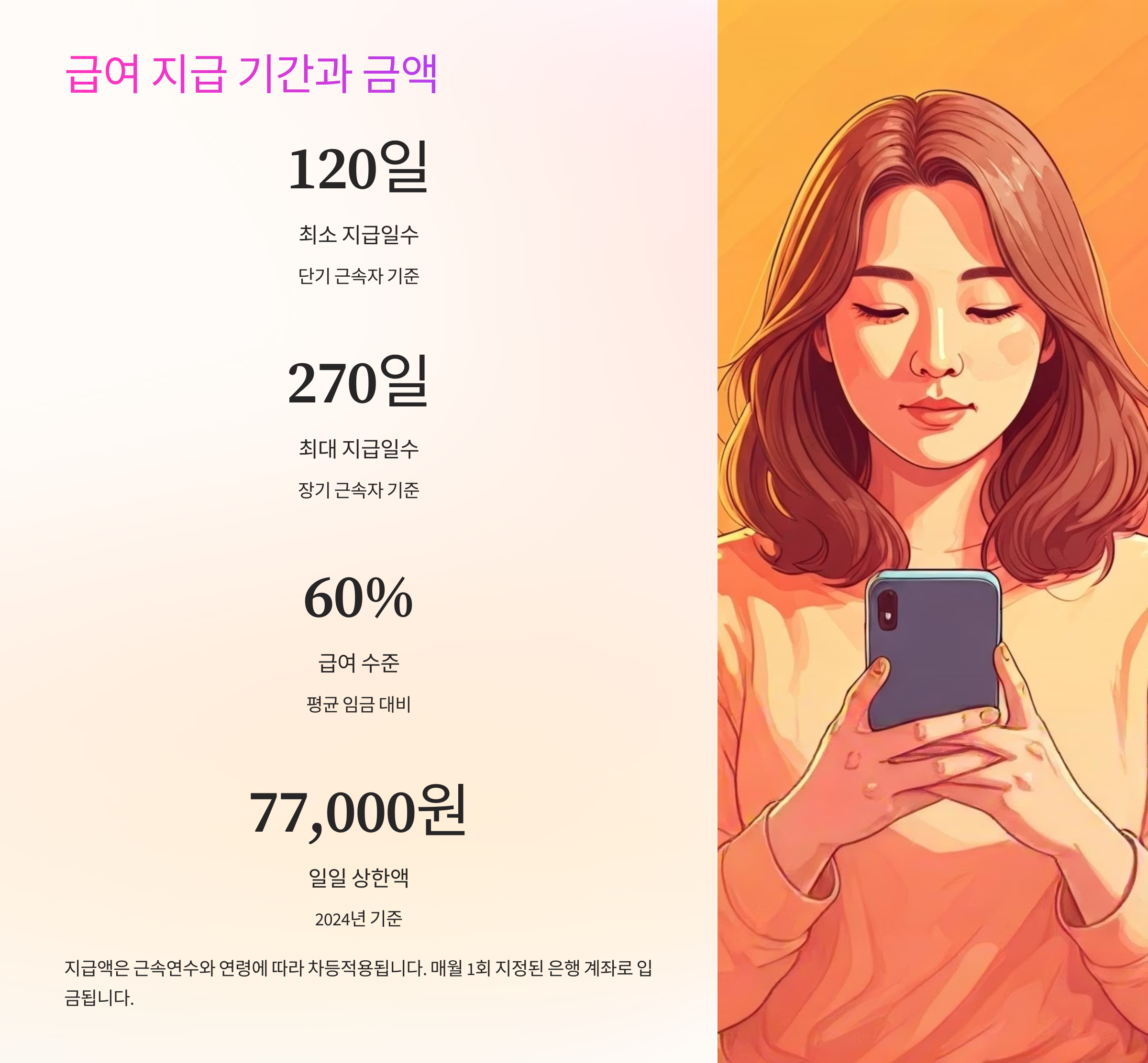 | 지급 금액 | 평균임금의 60% | 하루 최소 77,664원 ~ 최대 77,664원 |