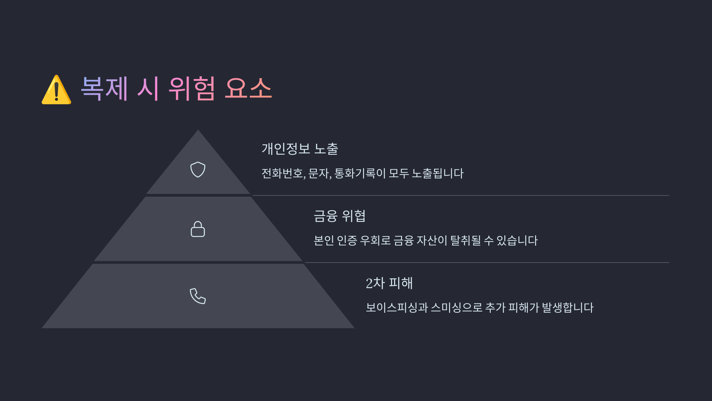 이처럼 유심 복제는 단순한 보안 문제가 아니라, 일상생활 자체를 위험에 빠뜨릴 수 있는 아주 심각한 범죄 행위예요.