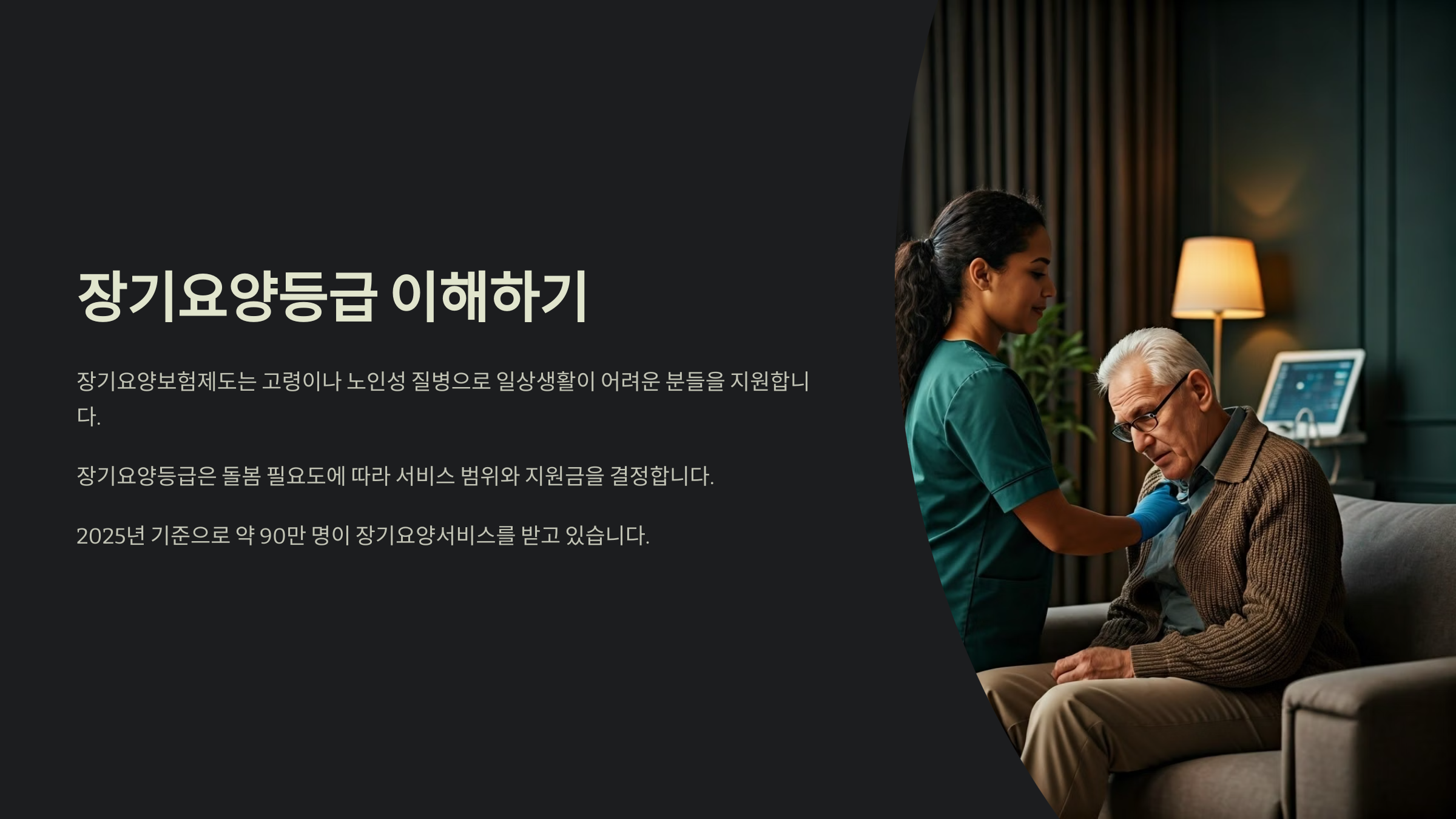 | 1등급 | 전신마비 또는 전적 도움 필요 | 방문요양, 요양시설 입소 |