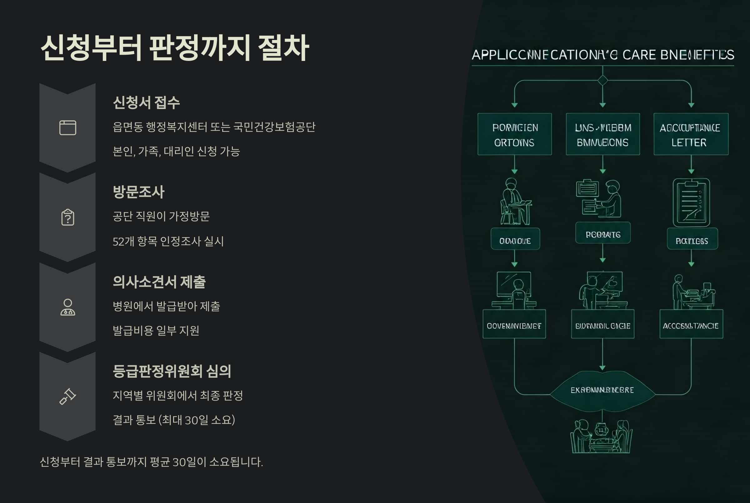 평가자는 공단 직원 또는 지정 조사원이 직접 가정에 방문해 체크하고, 의사소견서와 함께 위원회 심의를 거쳐 등급이 최종 결정돼요.