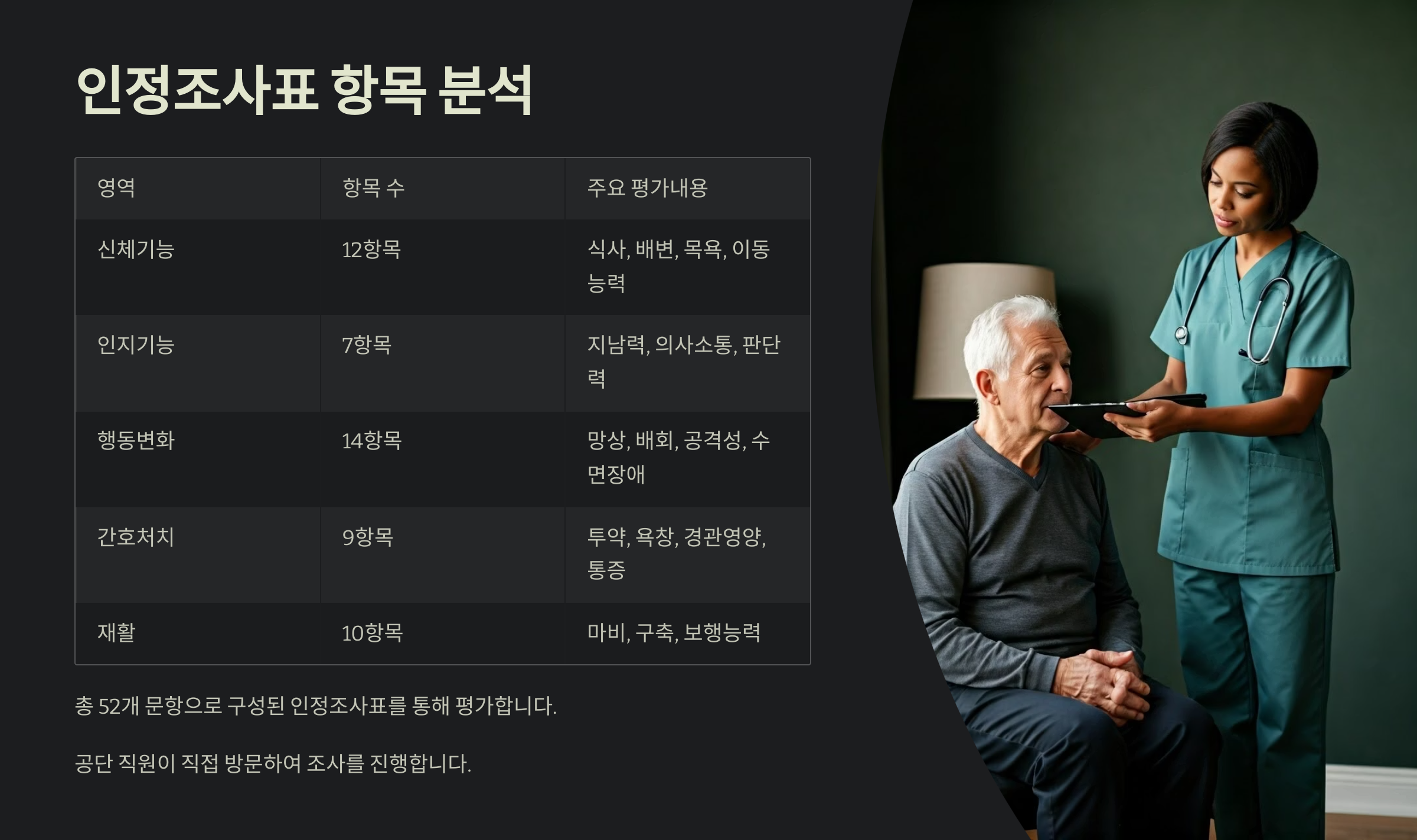 이 점수는 신체기능, 인지기능, 행동변화, 간호처치 등 총 52문항을 기준으로 산출돼요.
