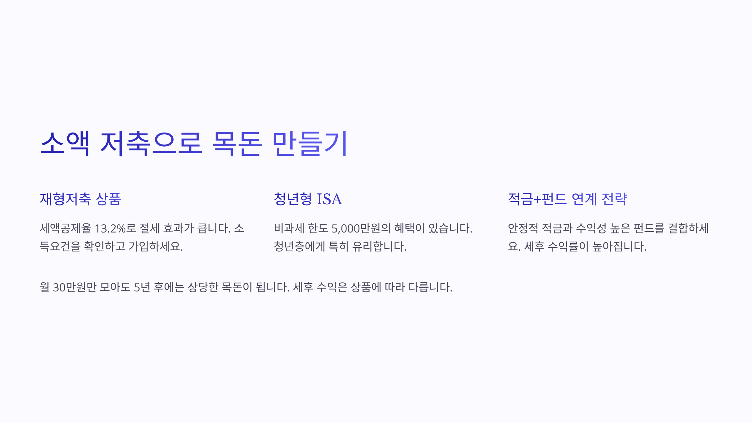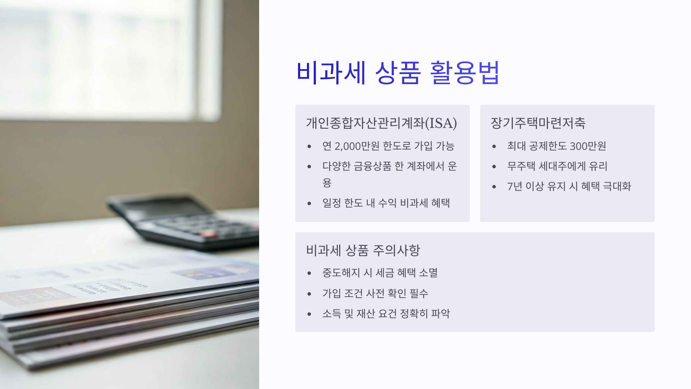 | 비과세 혜택 | ISA, 비과세 저축 | 소득 조건 확인 |