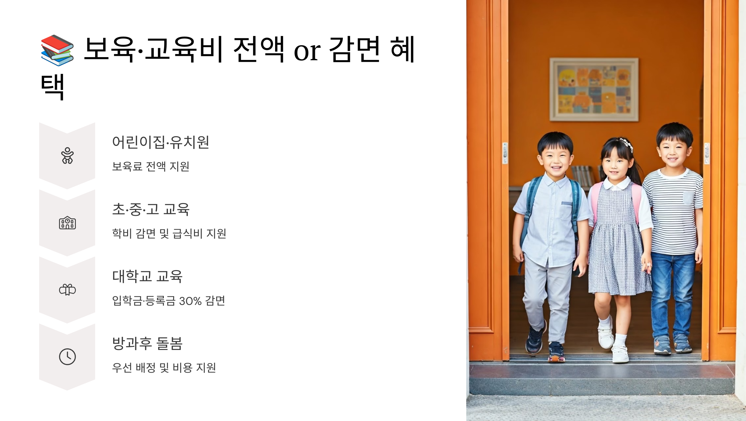 유치원생이라면 유아학비가 지원되고, 초등학교부터 고등학교까지는 입학금·수업료가 면제되기도 해요.