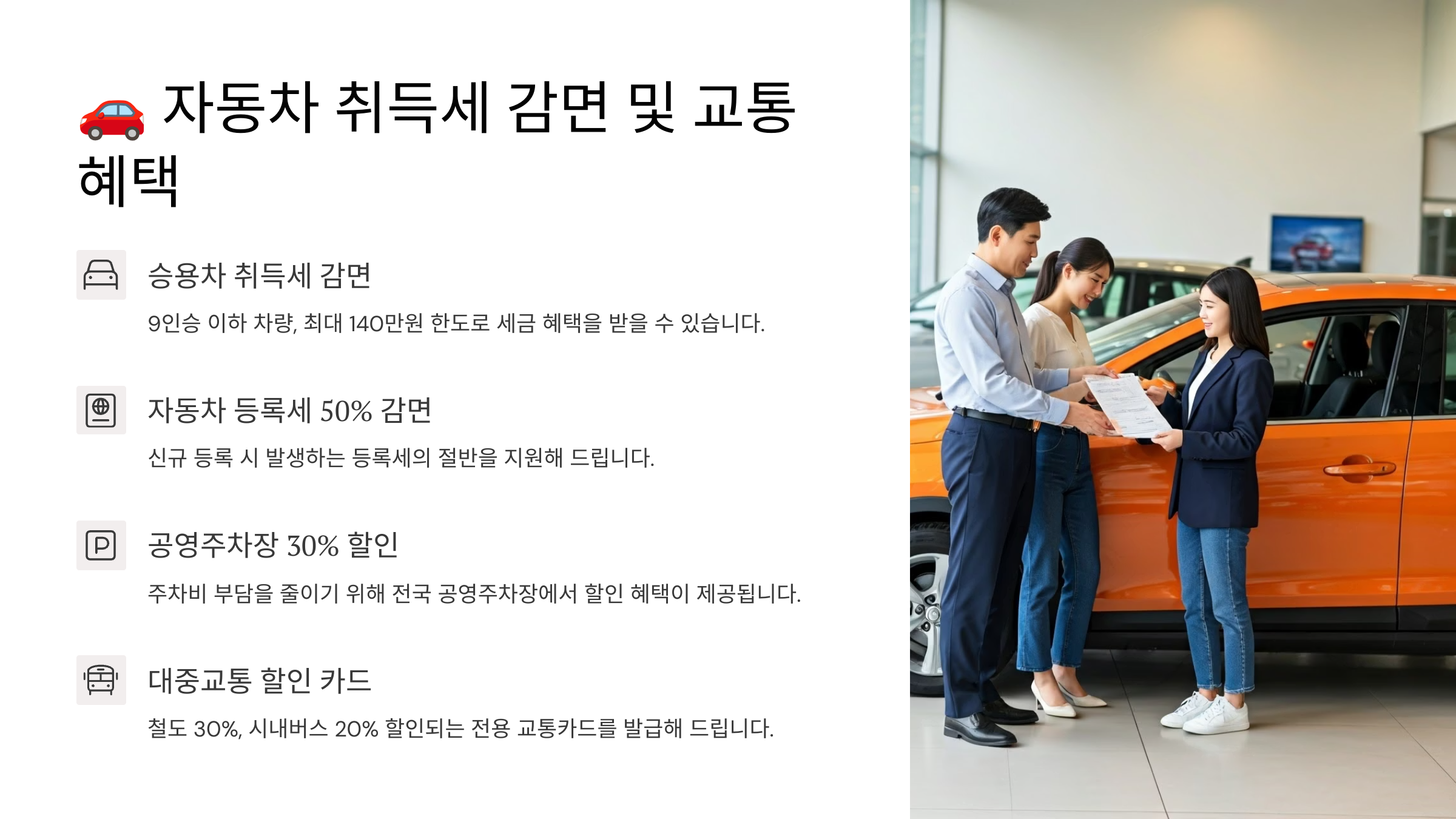 또한 고속도로 통행료 할인, 지자체 주차비 감면, 공영주차장 우선 이용권 등 교통 관련 혜택도 다양하답니다.