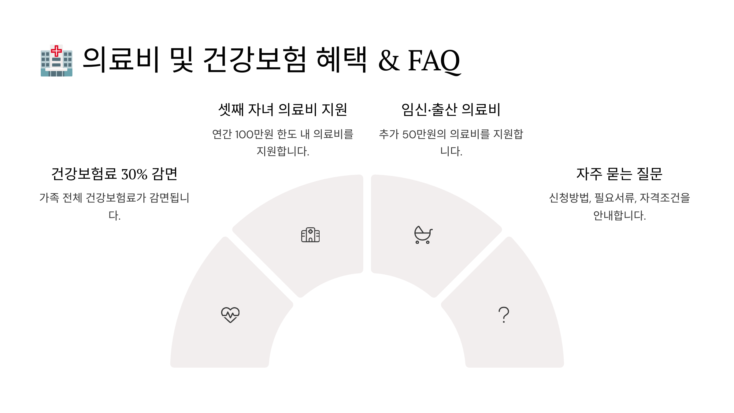 건강보험공단에 신청하면 자녀 수에 따라 보험료가 일정 비율 감면되고, 국가건강검진 항목도 확대돼요.