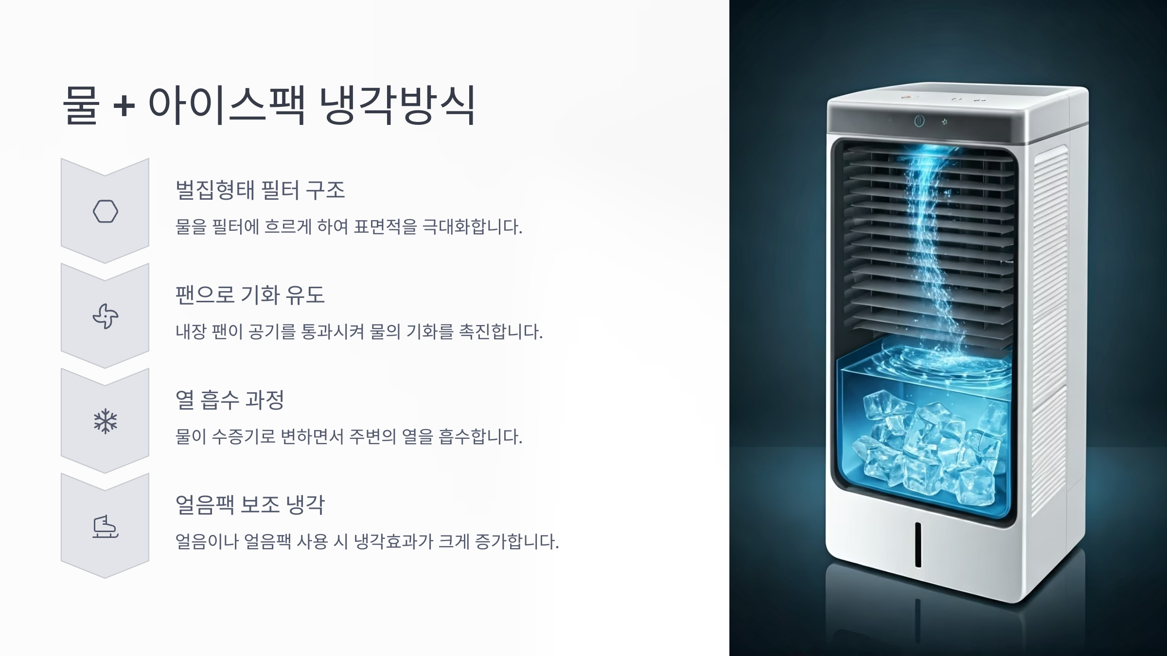 작동 원리는 간단해요. 내부에 물을 채우고, 팬이 돌면서 그 물을 흡수한 필터를 통과시키며 시원한 바람을 만들어내요.