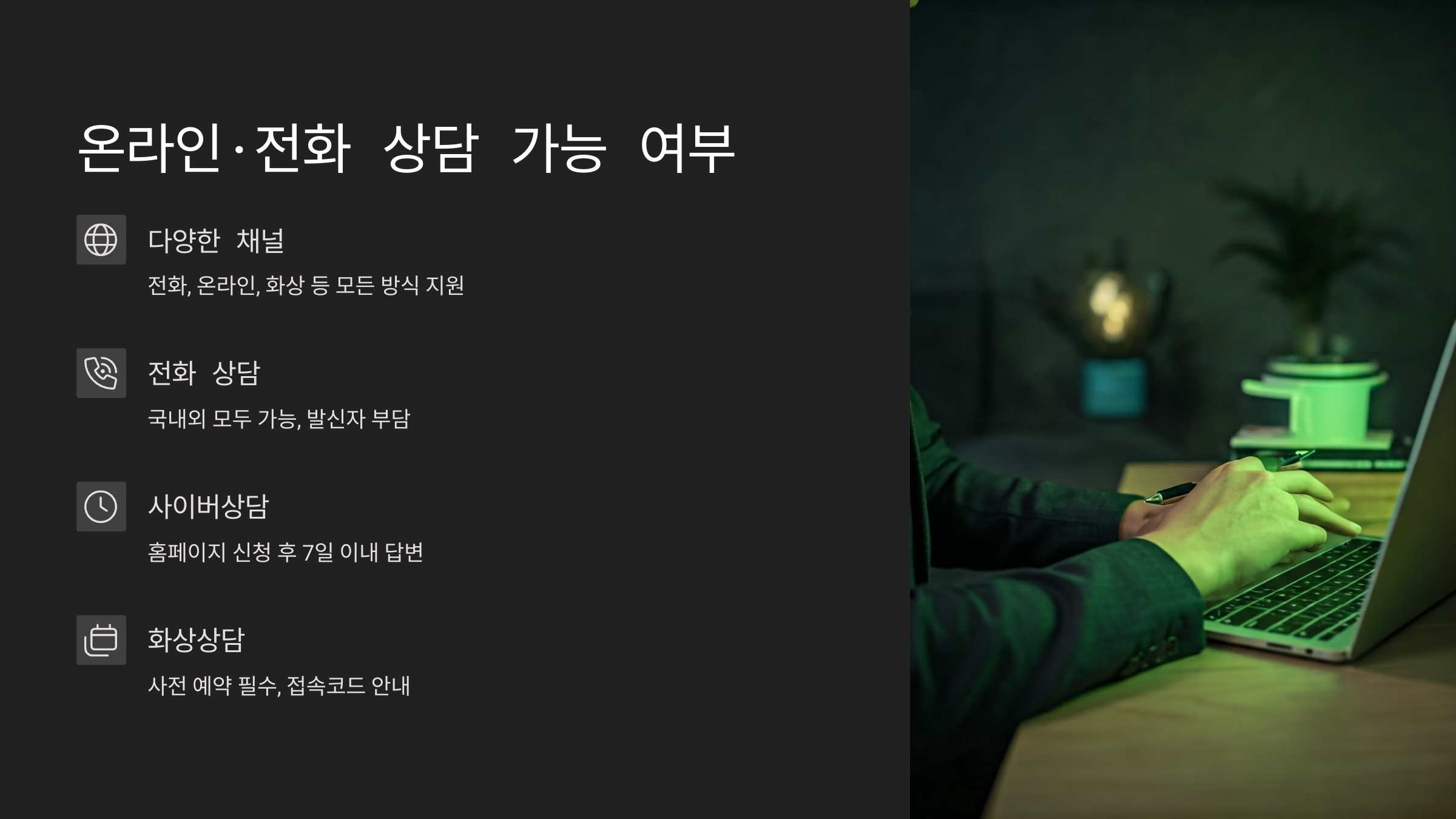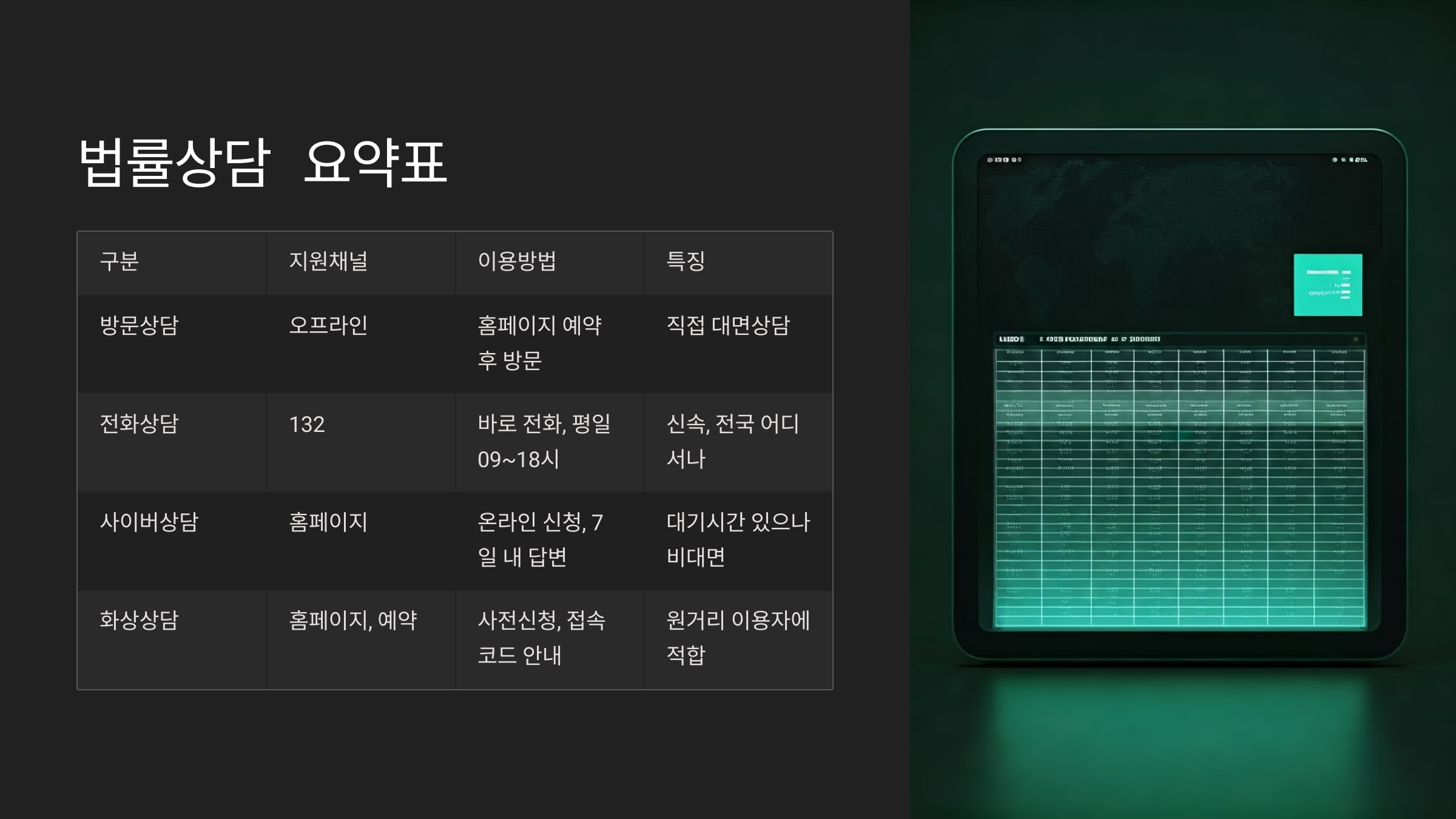 - 📞 132 법률상담 콜센터: 평일 09시~18시, 무료 전화상담 가능