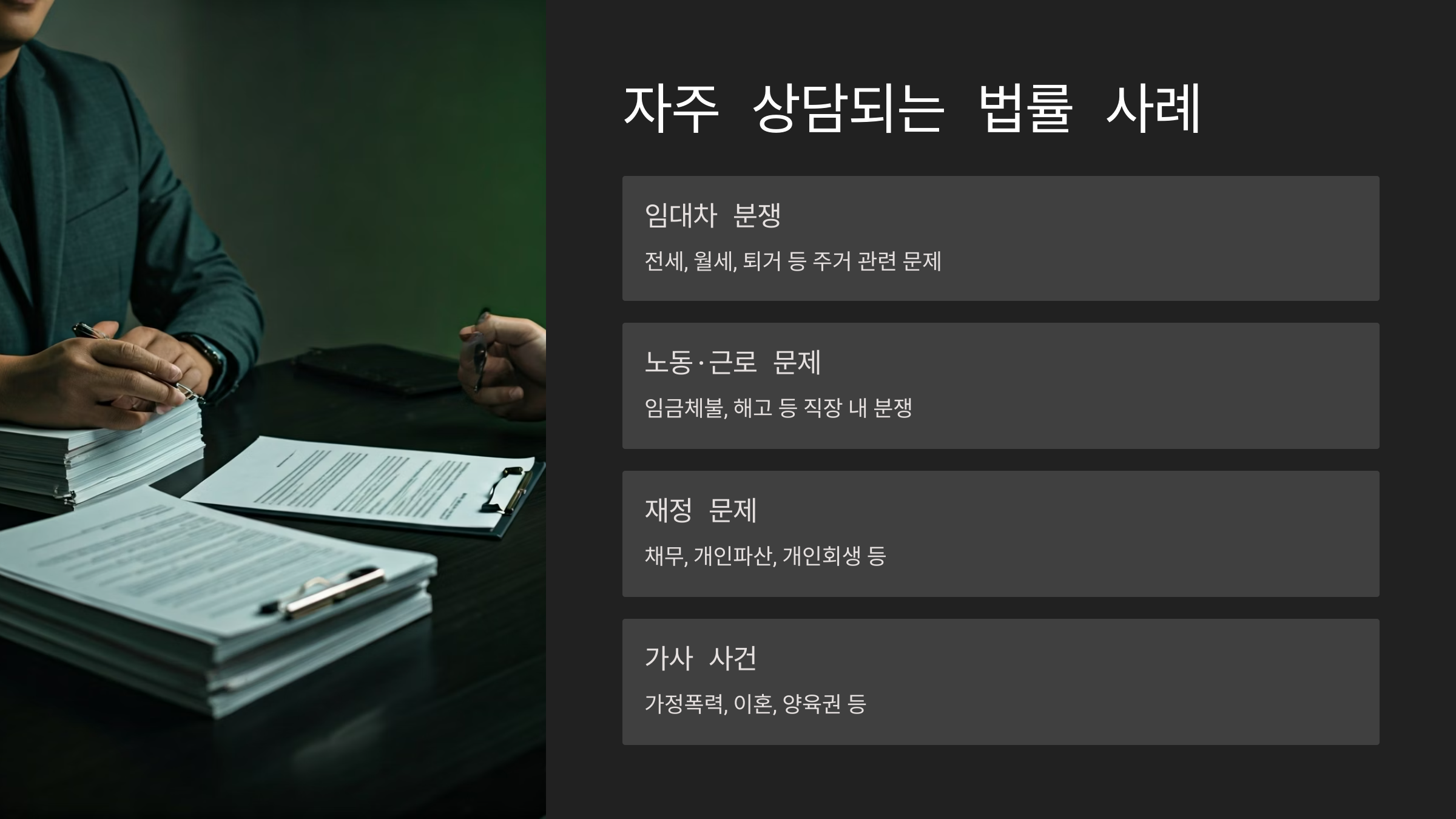 특히 제가 생각했을 때 ‘임대차 문제’, ‘채무불이행’, ‘가족 법률분쟁’ 같은 사례가 가장 많이 들어오는 것 같아요.