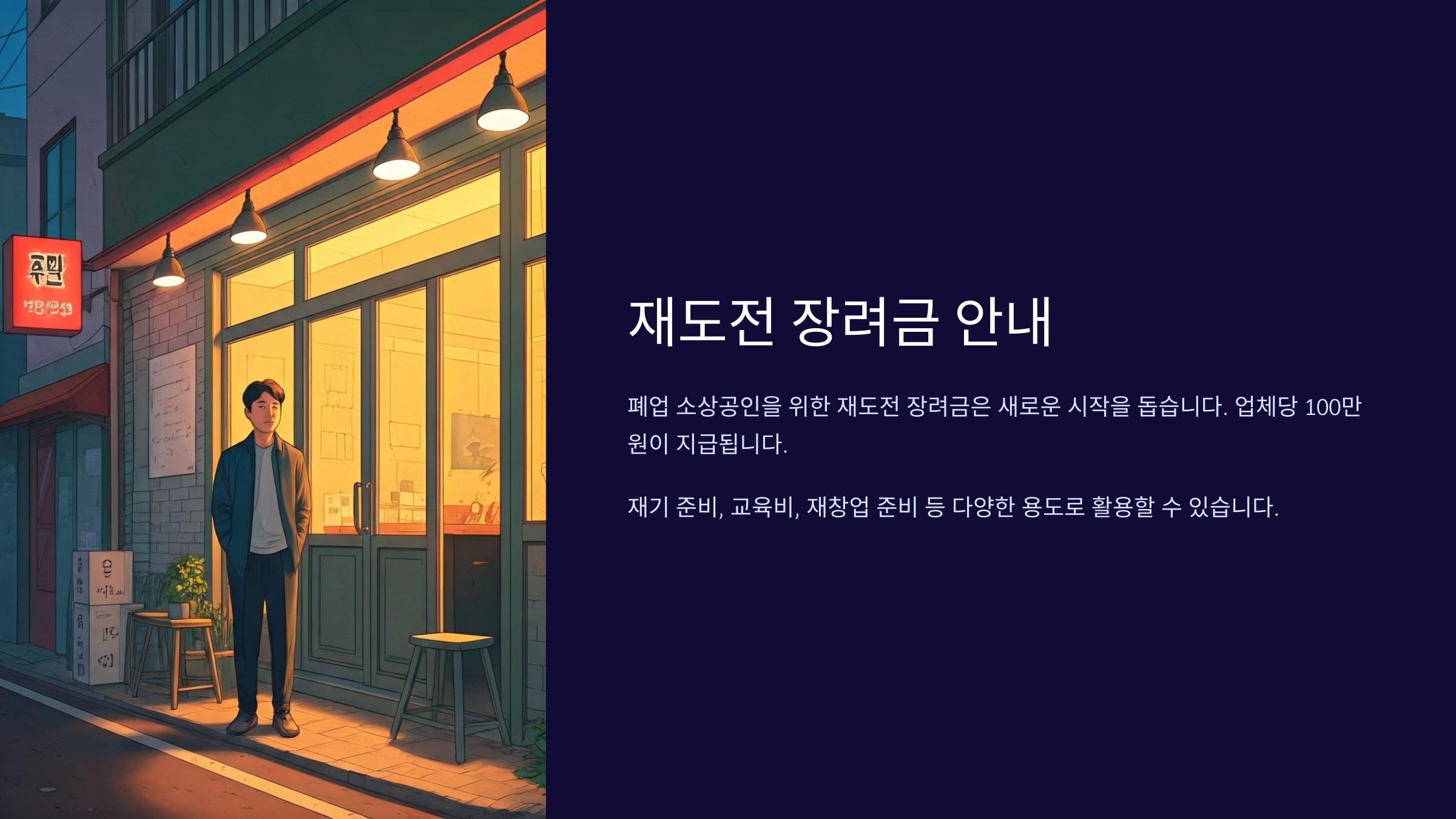 폐업했다고 좌절만 하긴 이르죠. 재도전 장려금은 사업 실패를 경험한 소상공인이 다시 일어설 수 있도록 마련된 제도에요. 최대 300만 원이라는 실질적인 자금은 재기 기반을 다지는 데 큰 도움이 되죠.