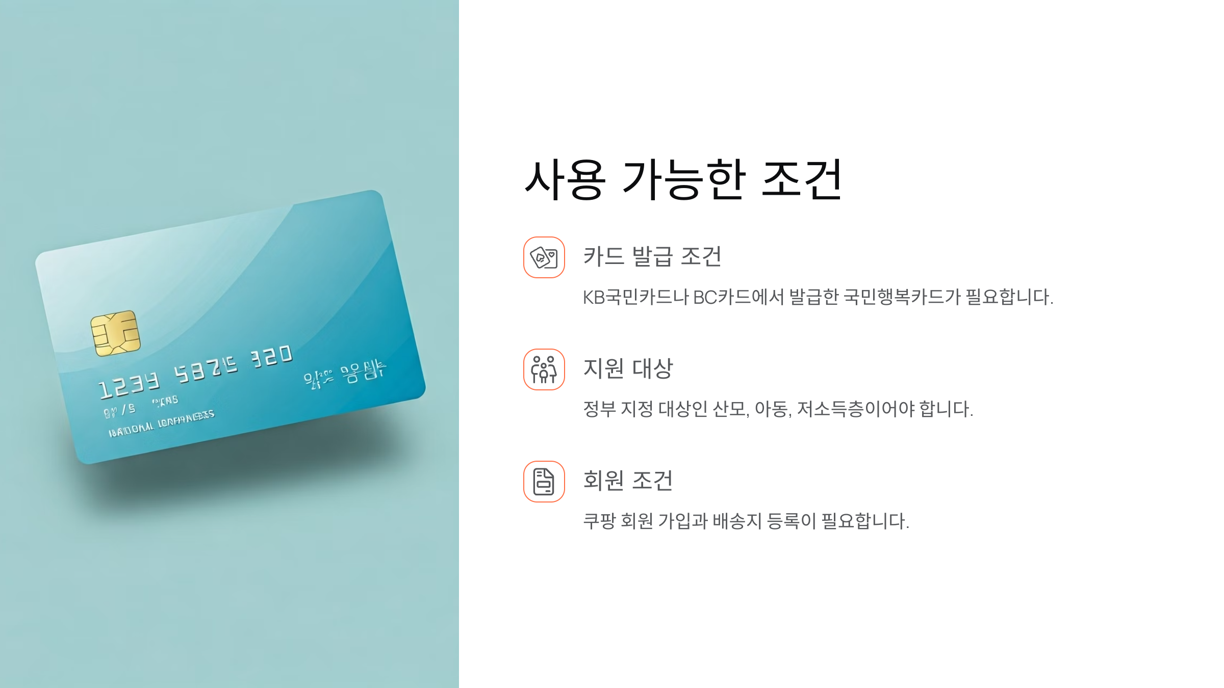 결론부터 말하자면, **쿠팡에서는 일부 카드사 국민행복카드만 등록 가능하고, 그것도 제한적인 품목에만 사용 가능해요.** 쿠팡이 첫만남이용권 공식 가맹 온라인몰은 아니기 때문에 모든 상품에 사용되지는 않아요.