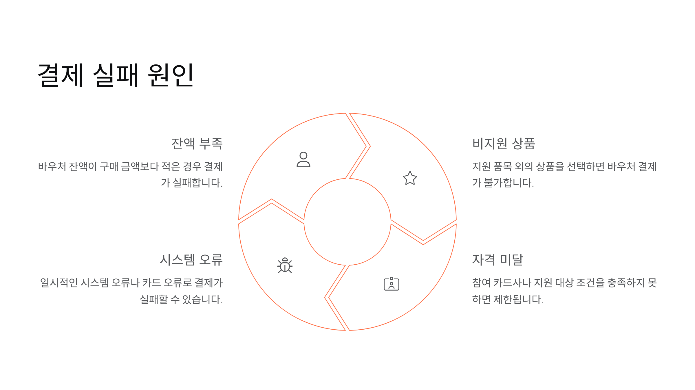 위 조건 중 단 하나라도 충족되지 않으면 바우처 잔액에서 차감되지 않고, 일반 결제로 처리돼요.