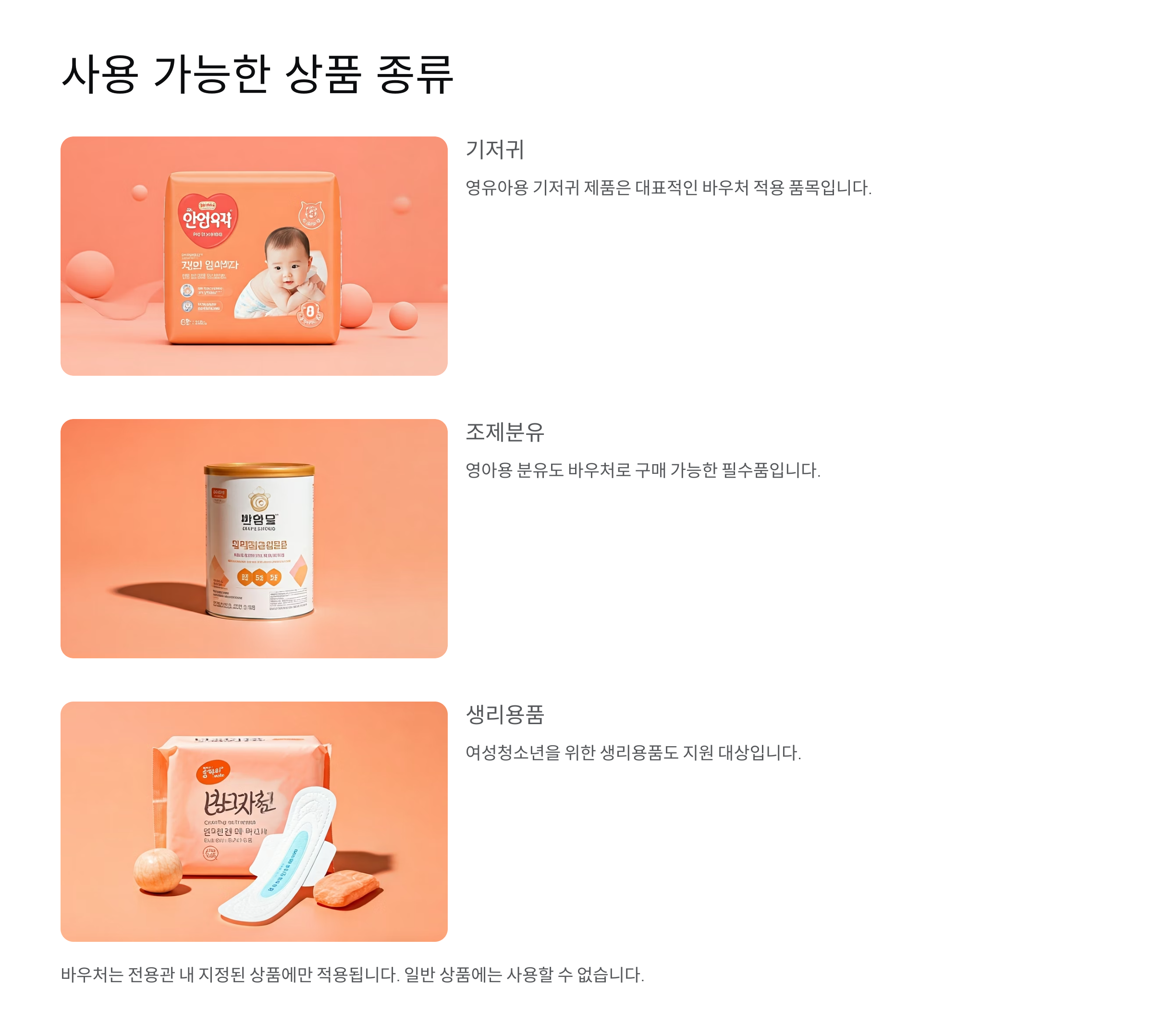 예를 들어 기저귀, 분유, 물티슈, 유모차 등은 바우처 사용 조건에 부합해요.