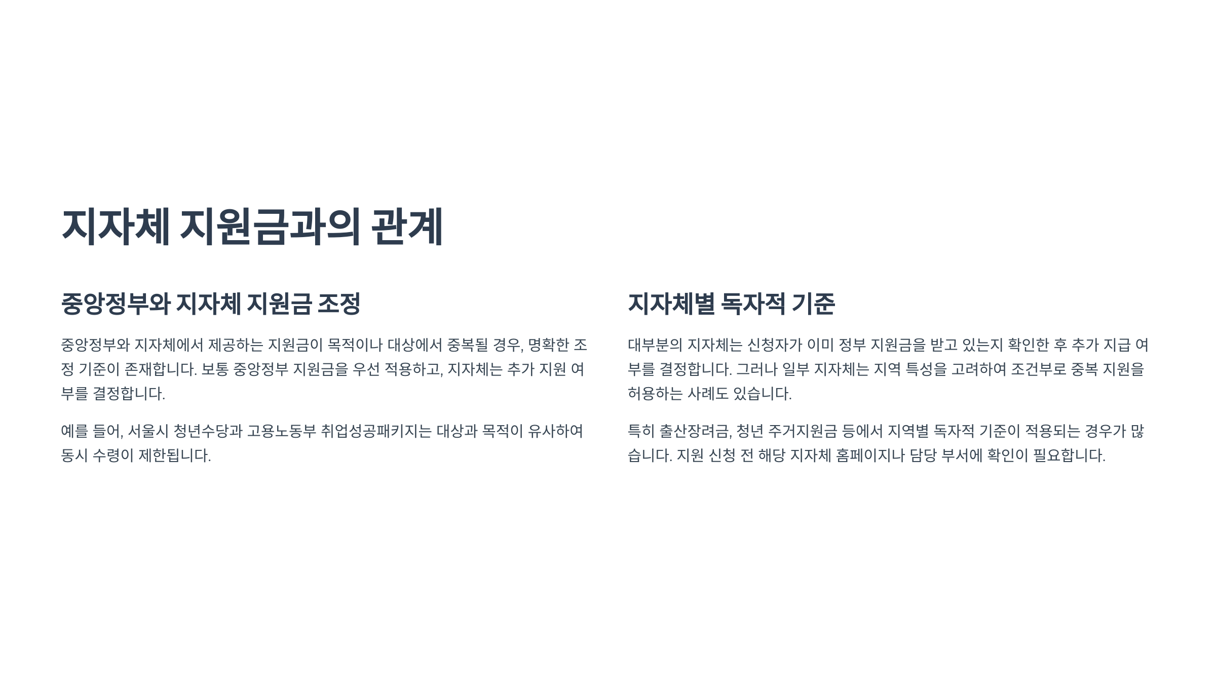 A3. 지자체 지원은 대부분 중복 가능하지만, 일부 생계성은 조정될 수 있어요.