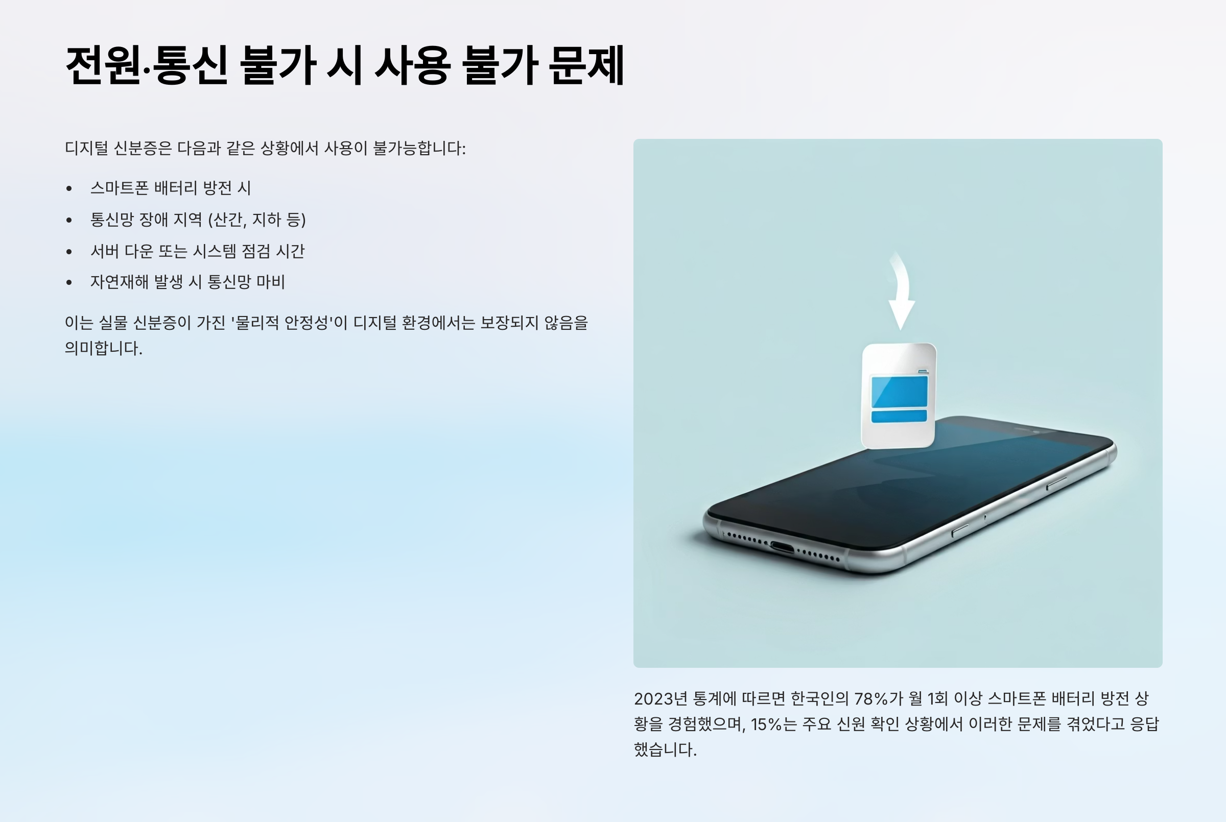 스마트폰이 꺼져 있거나 배터리가 없으면 신분증 자체가 작동하지 않아요. 📵
