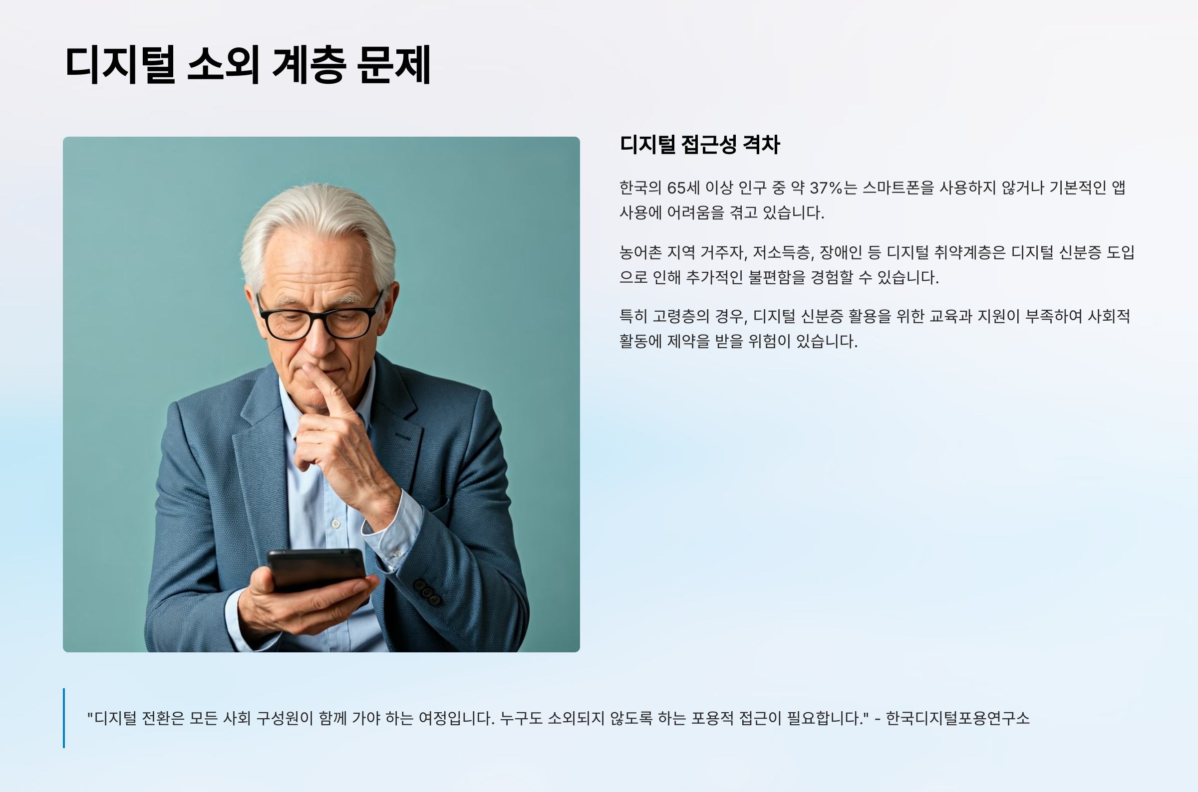 실제로 디지털 소외로 인해 공공서비스 접근이 어려운 사례가 늘고 있고, 주민센터 등에서는 ‘신분증 발급 도움 서비스’를 따로 운영하기도 한답니다.