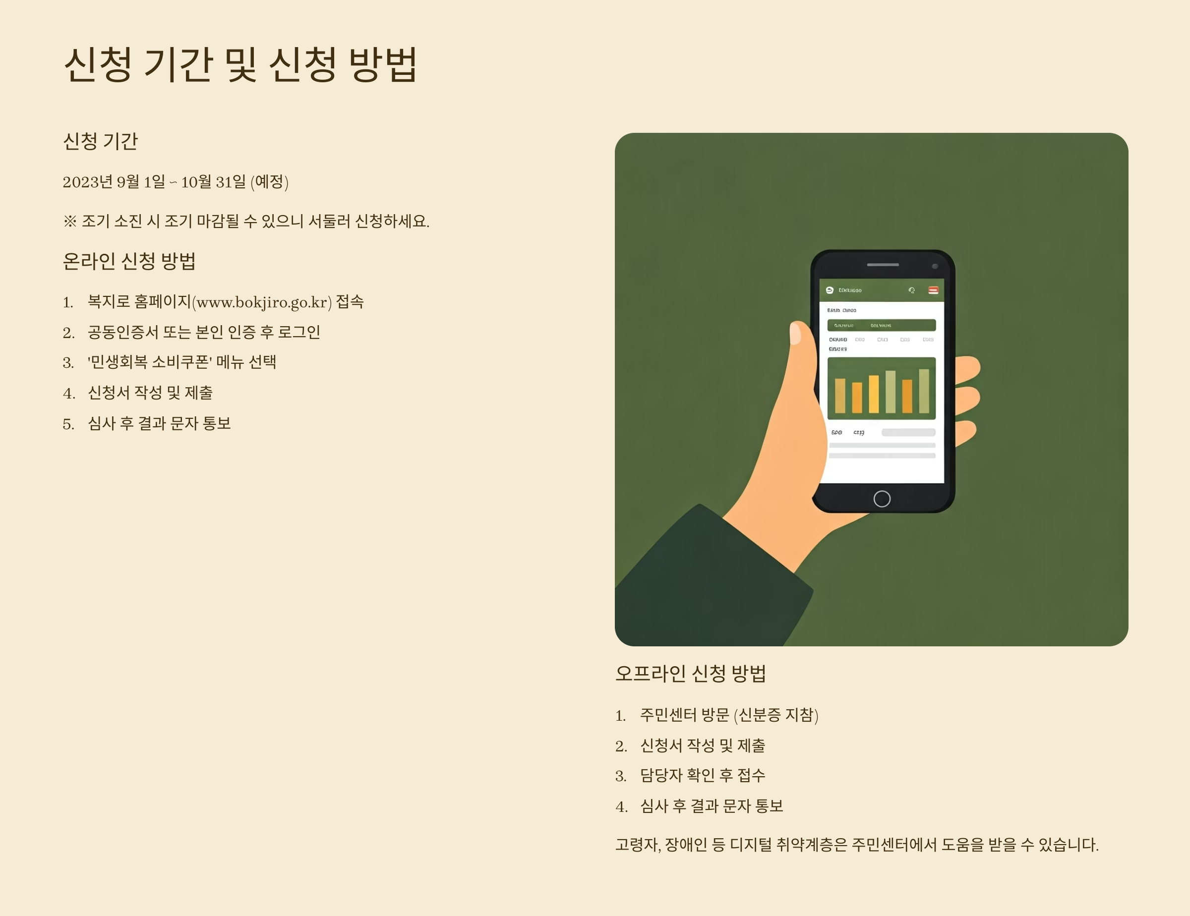이 쿠폰은 간편하게 신청할 수 있고, 신용/체크카드에 연동되어 소비 시 자동 차감되는 방식으로 지급돼요.