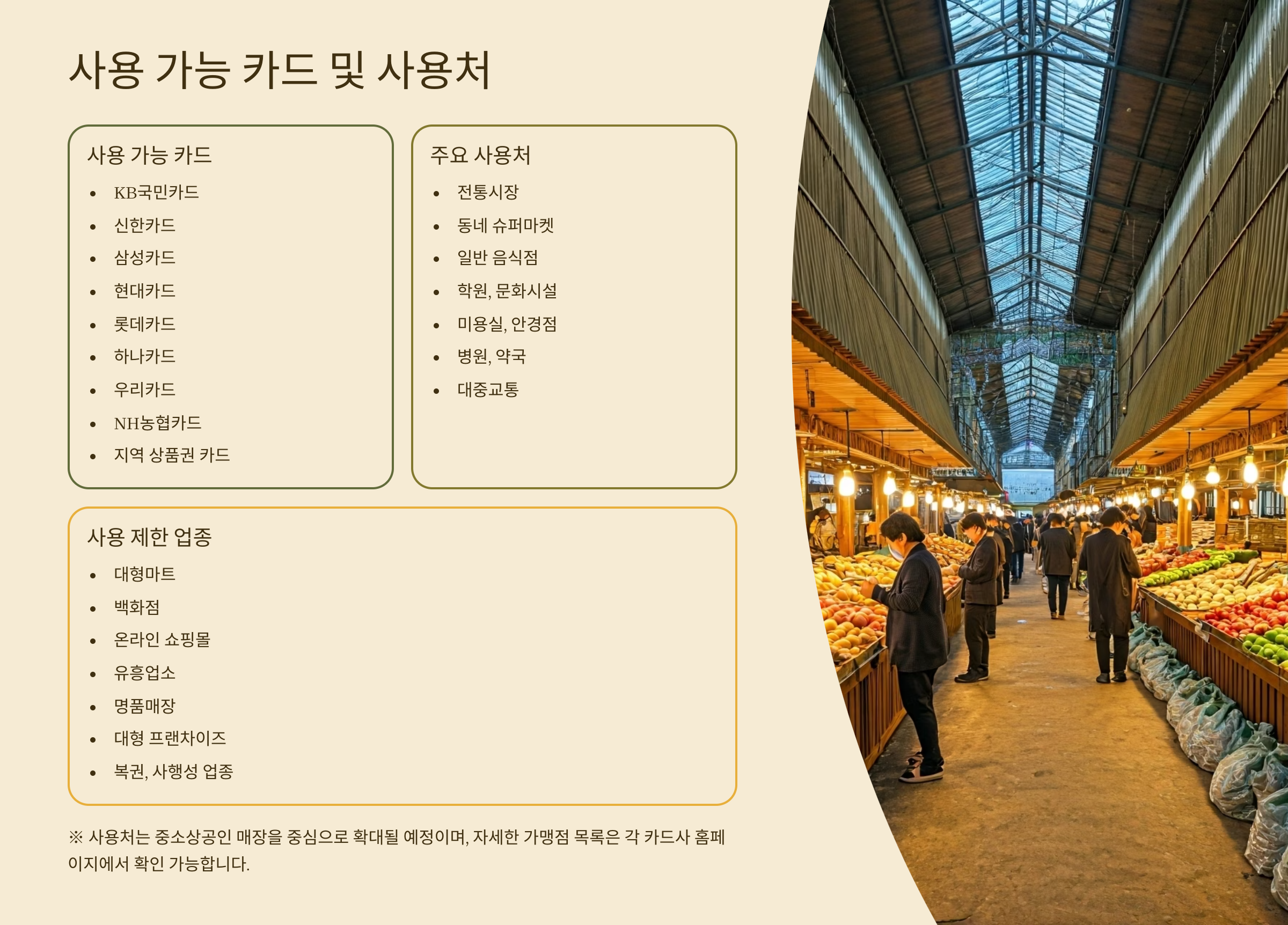 ❌ 백화점, 대형마트, 면세점, 온라인몰, 유흥업소 등은 사용 제한 업종이에요.