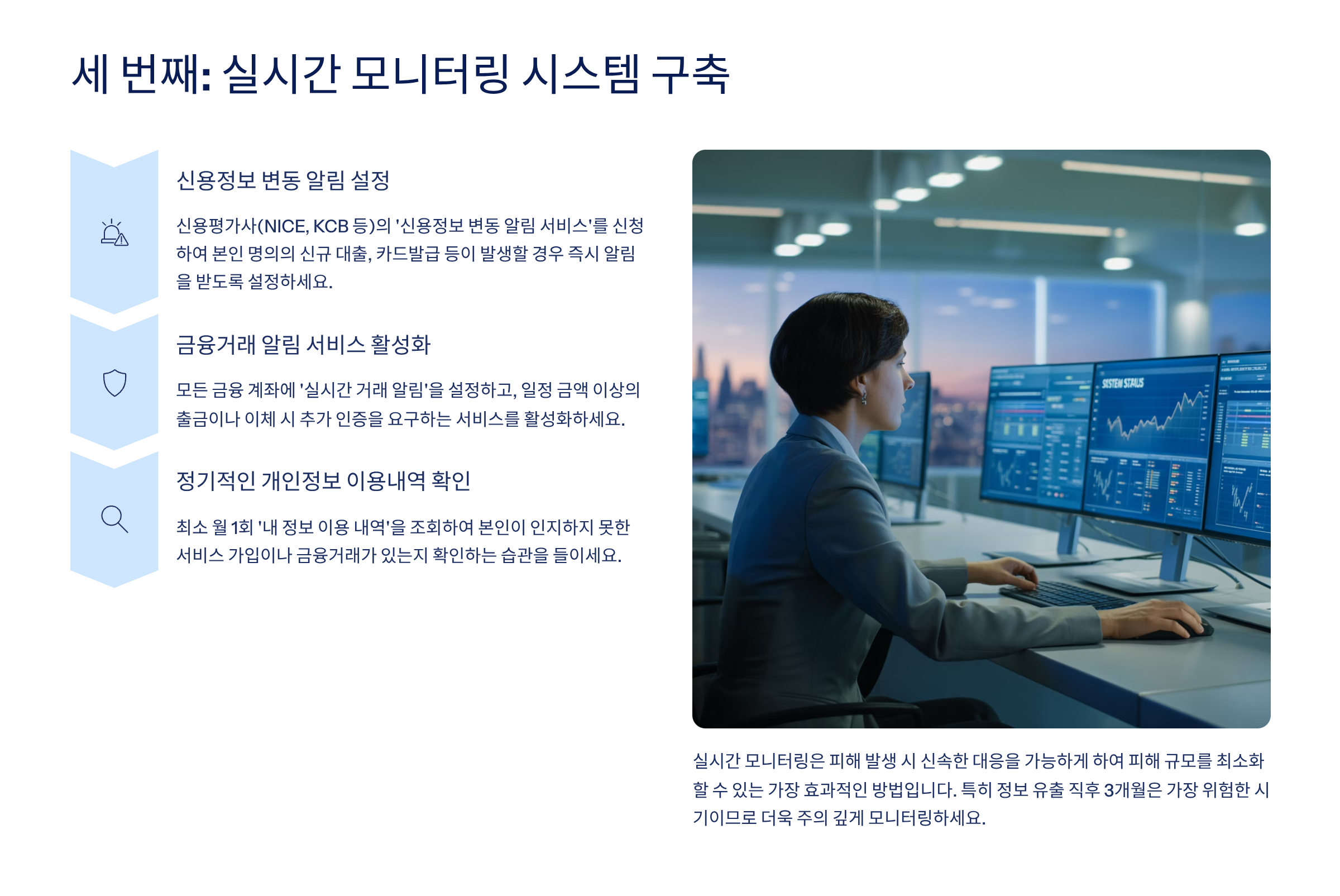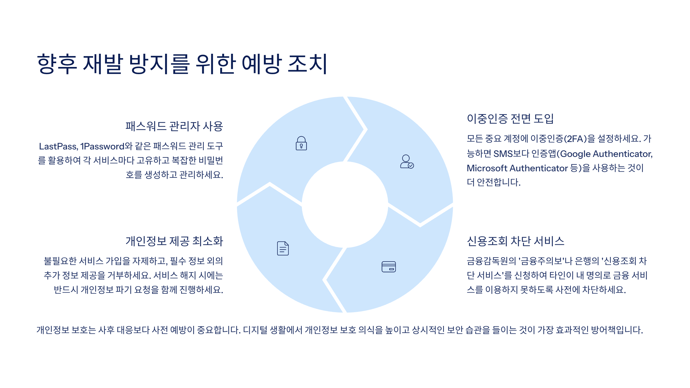 A8. 가장 중요한 것은 지속적인 모니터링입니다. 금융거래 내역, 신용정보 조회 기록, 온라인 계정 활동을 정기적으로 확인하고, 조금이라도 이상한 점이 발견되면 즉시 대응해야 합니다. 또한 강력한 비밀번호와 2단계 인증은 필수입니다.