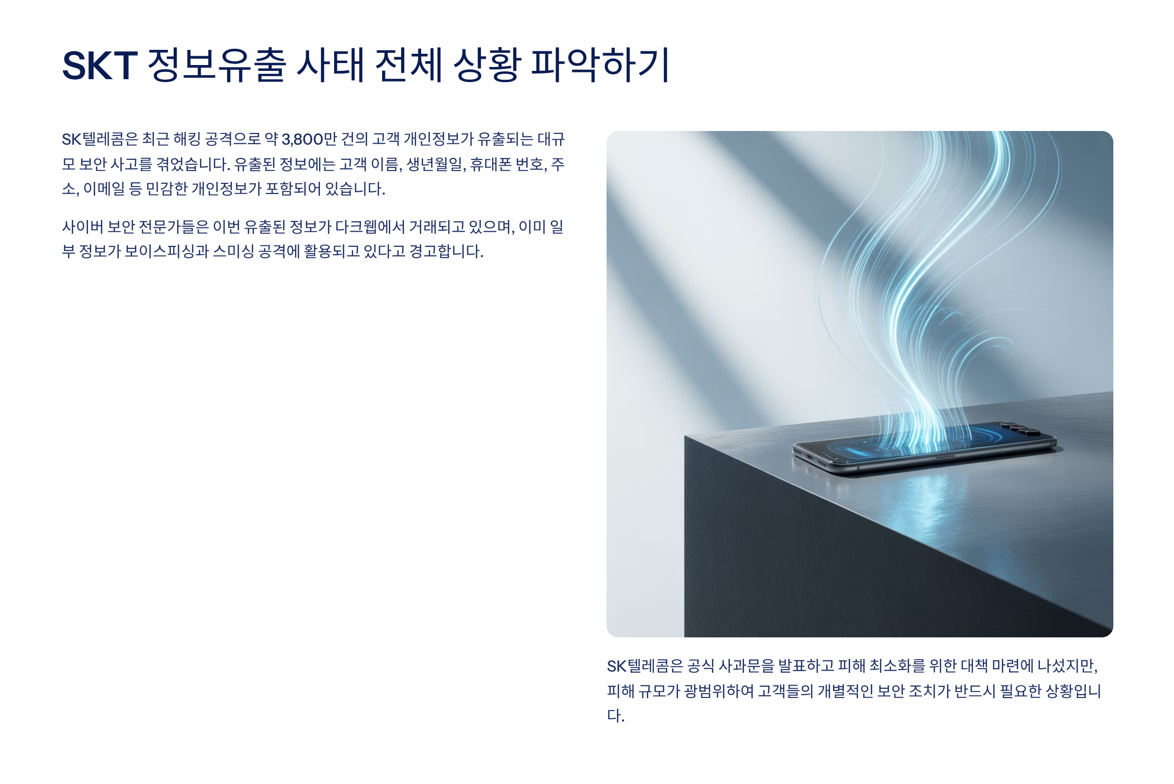 최근 SK텔레콤에서 발생한 대규모 고객정보 유출 사태로 많은 이용자들이 불안에 떨고 있습니다. 개인정보가 유출되면 보이스피싱, 스미싱, 명의도용 등 2차 피해로 이어질 수 있어 신속한 대응이 필요합니다. 이번 사태는 단순한 해킹 사고를 넘어 우리의 디지털 생활 전반에 대한 경각심을 일깨워주는 사건입니다. 지금 이 순간에도 유출된 정보가 범죄에 악용될 가능성이 있기에, SKT 고객이라면 반드시 확인하고 조치해야 할 3가지 핵심 사항을 정리했습니다.