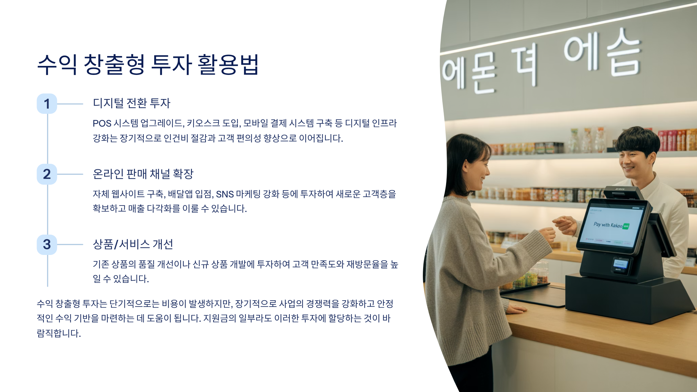 🔧 【POS 시스템 도입】 스마트 POS(월 3만원)를 도입하면 매출 관리, 재고 관리, 고객 관리가 자동화됩니다. 월 30시간의 업무 시간을 절약할 수 있어, 인건비 50만원 절감 효과가 있습니다.