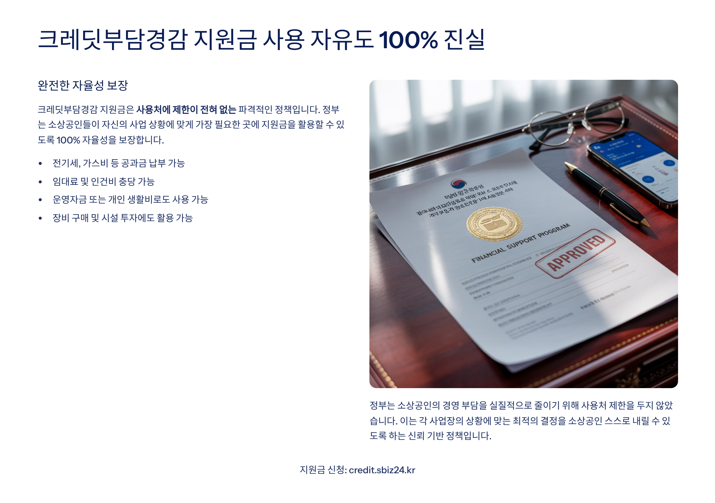 크레딧부담경감 지원금의 가장 큰 특징은 '무제한 사용 자유'입니다. 다른 정부 지원금과 달리 사용 내역을 보고할 필요도, 영수증을 제출할 필요도 없습니다. 입금된 순간부터 여러분의 자유로운 자금이 됩니다.