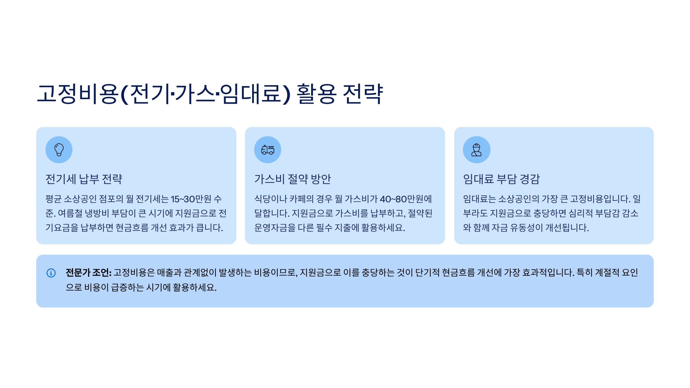 💰 【임대료 활용법】 임대료는 소상공인 최대의 고정비용입니다. 지원금 50만원은 소규모 점포 기준 0.5~1개월 임대료에 해당합니다. 임대료 연체로 인한 스트레스를 해소하고 신용도를 유지할 수 있습니다.