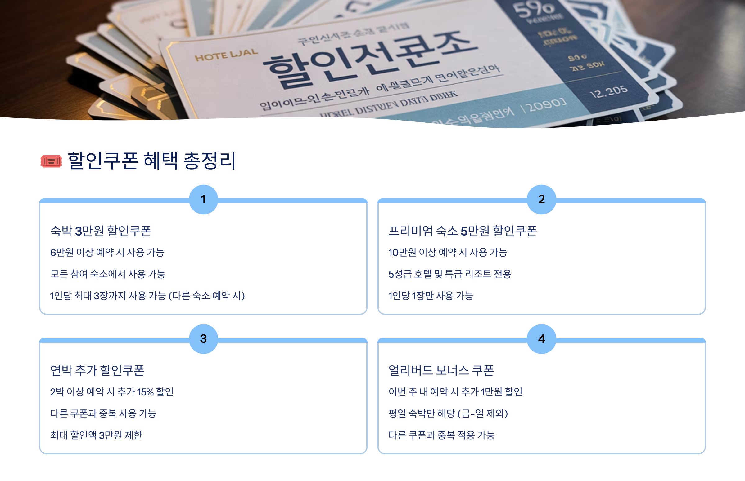 쿠폰을 쓰면 보통 1박 기준 3만 원 할인 혜택을 받을 수 있고, 일부 지역 쿠폰이나 카드사 이벤트와 중복으로 쓰면 50% 이상 절약도 가능해요. 💸