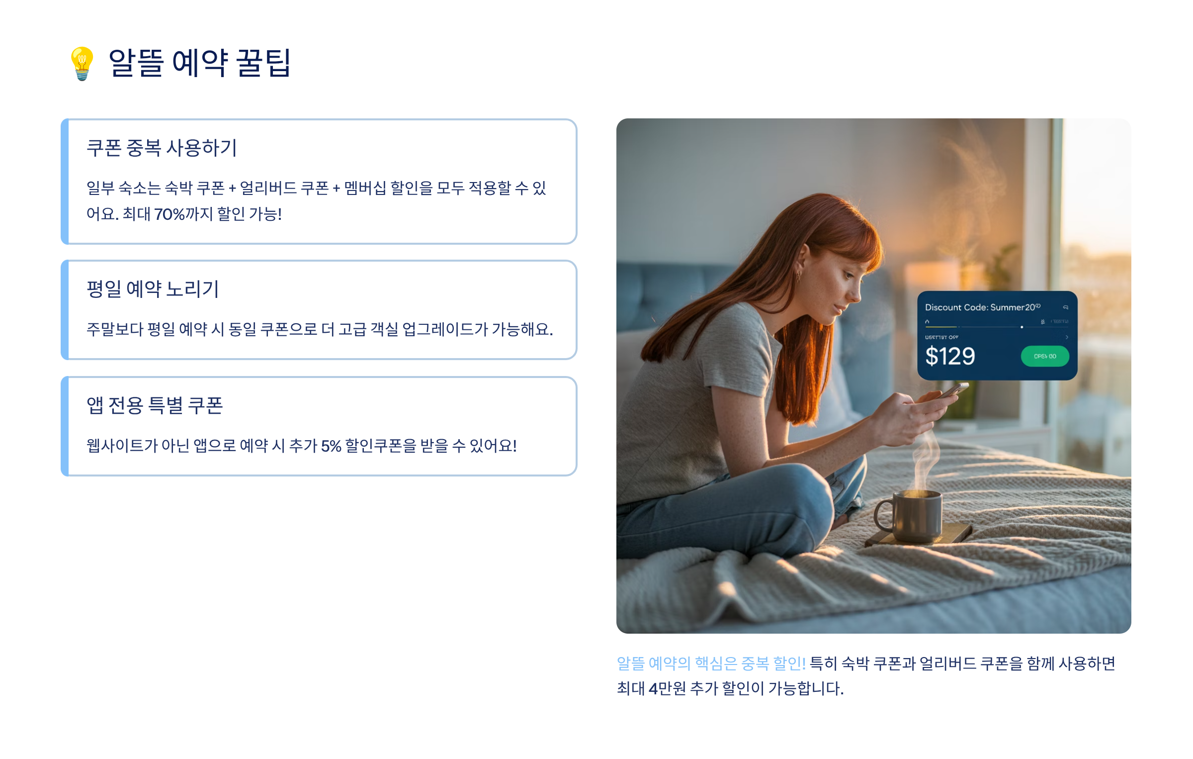 특히 성수기에는 가격 자체가 올라있기 때문에, 쿠폰이 없으면 체감 차이가 더 커요. 반대로 쿠폰을 쓰면 "비싼 성수기에도 저렴하게 잘 묵었다"는 만족감을 느낄 수 있어요. 🙌