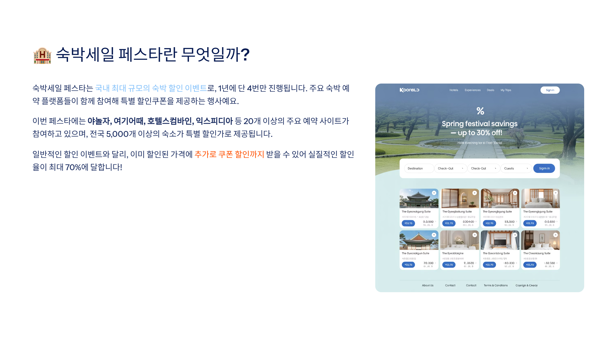 숙박세일 페스타는 문화체육관광부와 한국관광공사가 주관하는 국내 여행 활성화 캠페인이에요. 🏖️