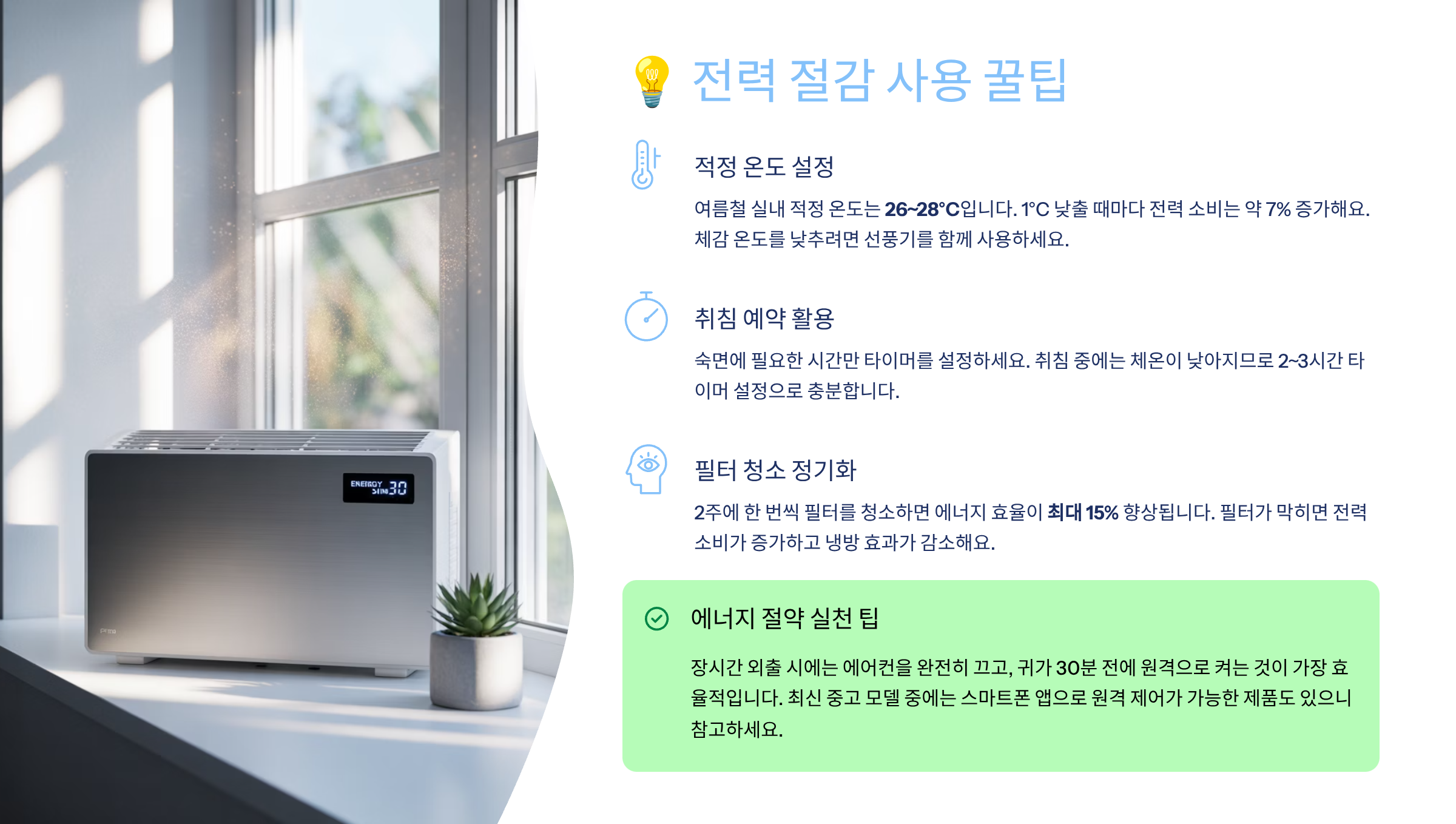 중고에어컨이라도 이렇게 관리하고 사용하면, 새 제품 못지않은 절약 효과를 누릴 수 있어요. 결국 ‘효율 + 습관’이 전기세 절약의 비밀이에요! 📉