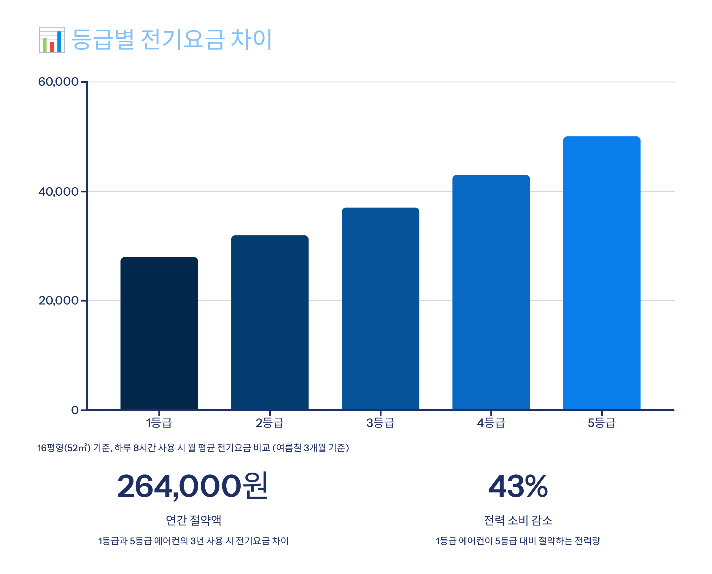 에너지 효율 등급 차이는 단순히 숫자가 아니라 매달 전기요금으로 직결돼요. 같은 공간, 같은 사용 시간이어도 1등급과 3등급 에어컨은 꽤 큰 요금 차이를 보여요. 📉