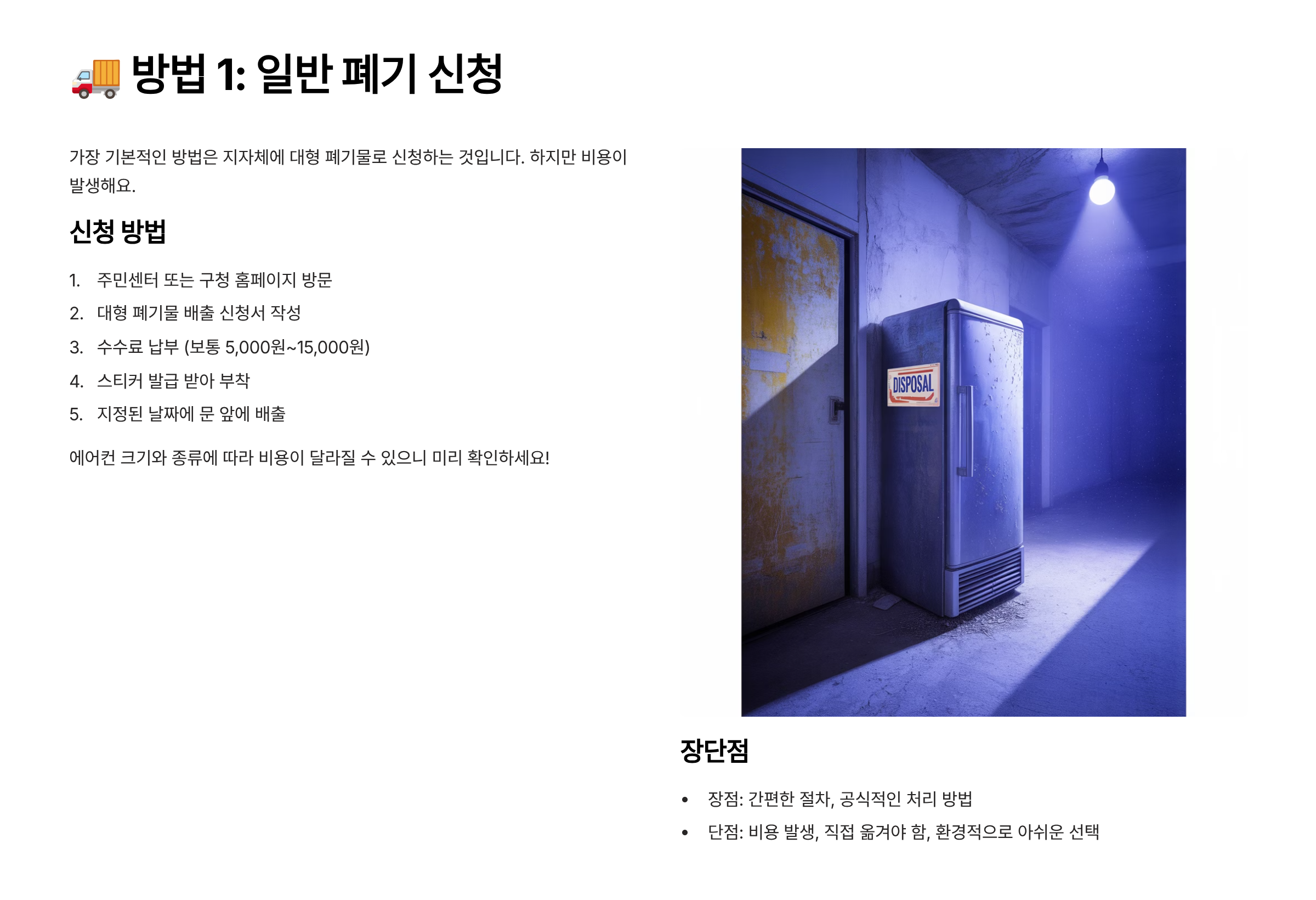 일반 폐기의 장점은 행정 절차만 따르면 누구나 가능하다는 점이에요. 단점은 철거와 운반을 직접 준비해야 하고, 철거비와 폐기물 수수료가 따로 들어간다는 거예요. 💸