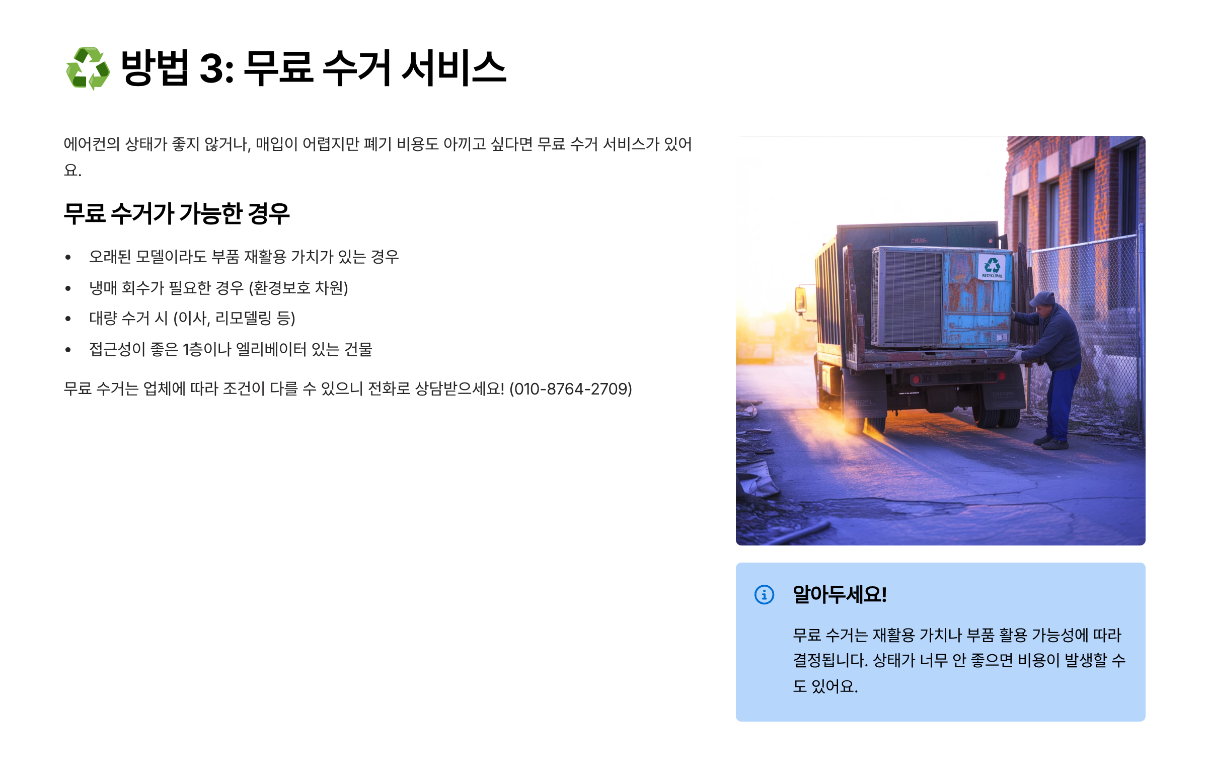 📞 중고 에어컨 처분, 어떤 방법이 가장 이득일지 헷갈리신다면 지금 바로 상담 받아보세요. 상황에 맞게 무료 수거, 매입, 폐기 중 최적의 방법을 안내해드려요.