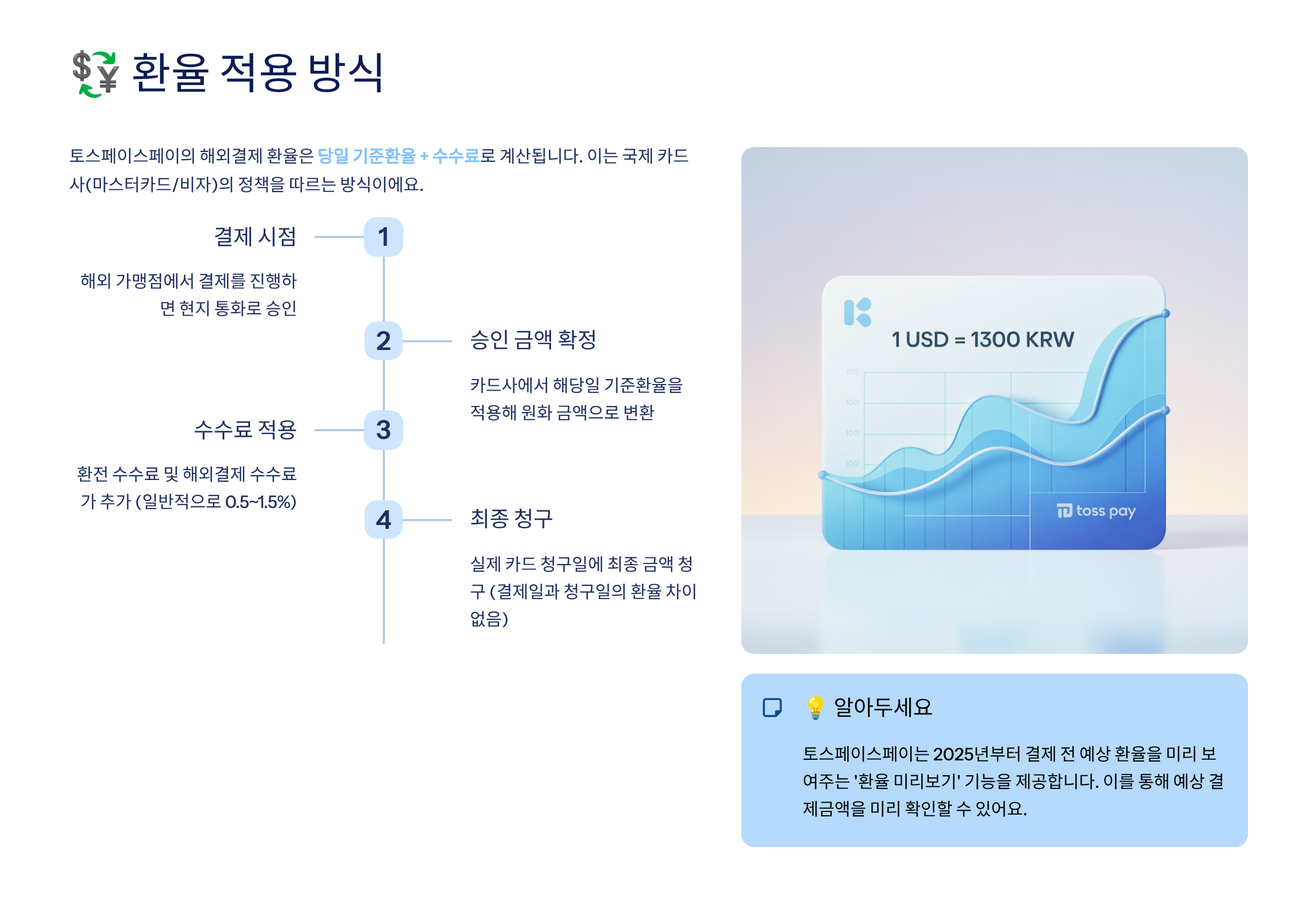 이때 적용되는 환율은 실시간으로 자동 갱신되는 환율</strong이라서, 토스 앱에서 매일 확인할 수 있어요. 환율이 불리할 때 결제하면 더 많은 원화가 빠져나가기 때문에, 미리 환율 확인은 필수</strong예요!