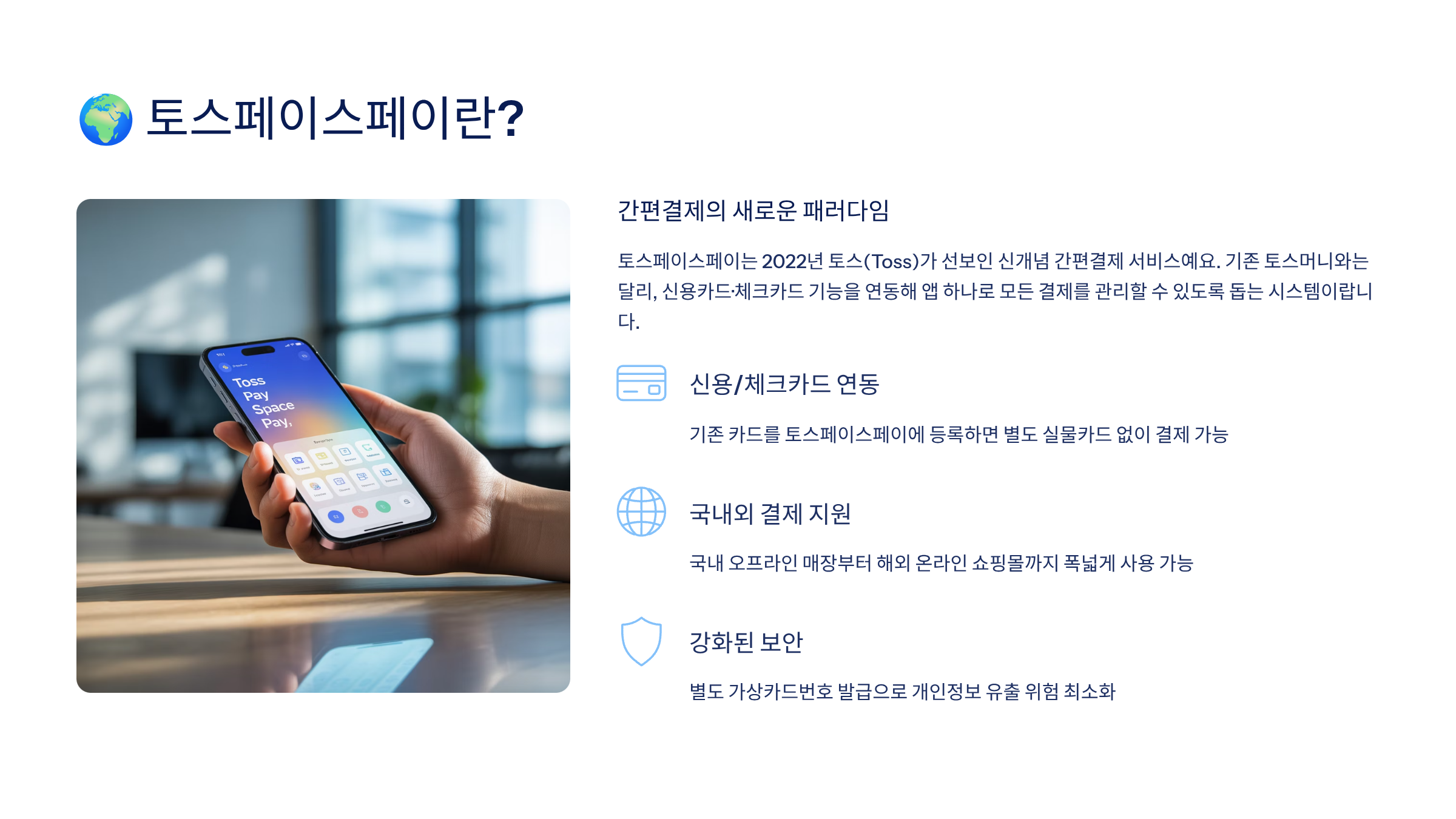 토스페이스페이는 2022년 토스(Toss)가 선보인 신개념 간편결제 서비스예요. 기존 토스머니와는 달리, 신용카드·체크카드 기능을 연동해 앱 하나로 모든 결제를 관리할 수 있도록 돕는 시스템이랍니다. 삼성페이나 애플페이와 유사한 구조지만, 국내에서는 훨씬 간편한 UX를 자랑해요.