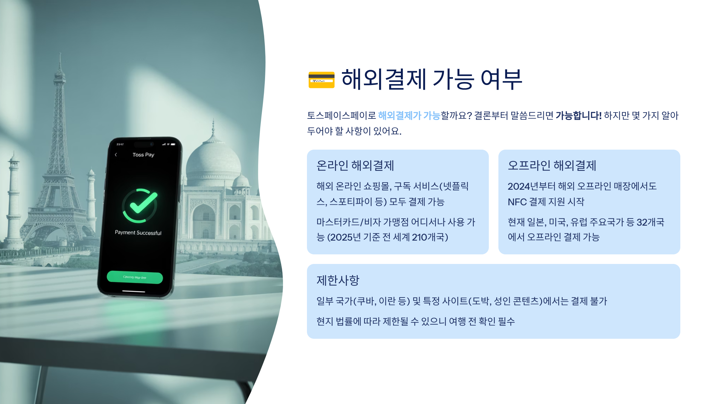 토스페이스페이의 가장 큰 장점 중 하나는 바로 해외 결제가 가능하다는 점이에요. 대부분의 국내 간편결제 서비스는 국내용으로 제한되지만, 토스페이스페이는 예외예요. 왜냐하면 Visa 가상카드 기능을 통해 국제결제 네트워크에 직접 연결되기 때문이에요.