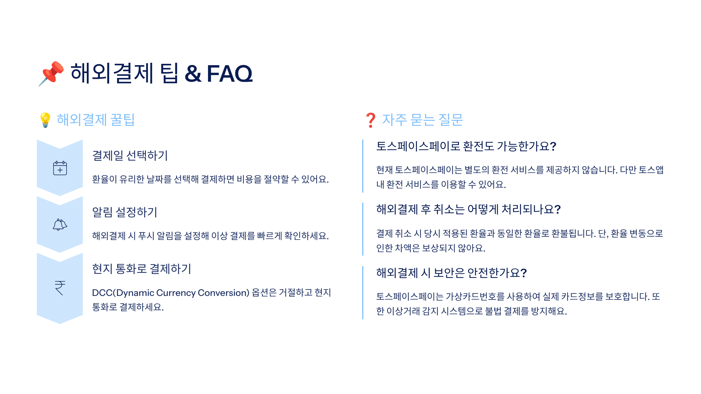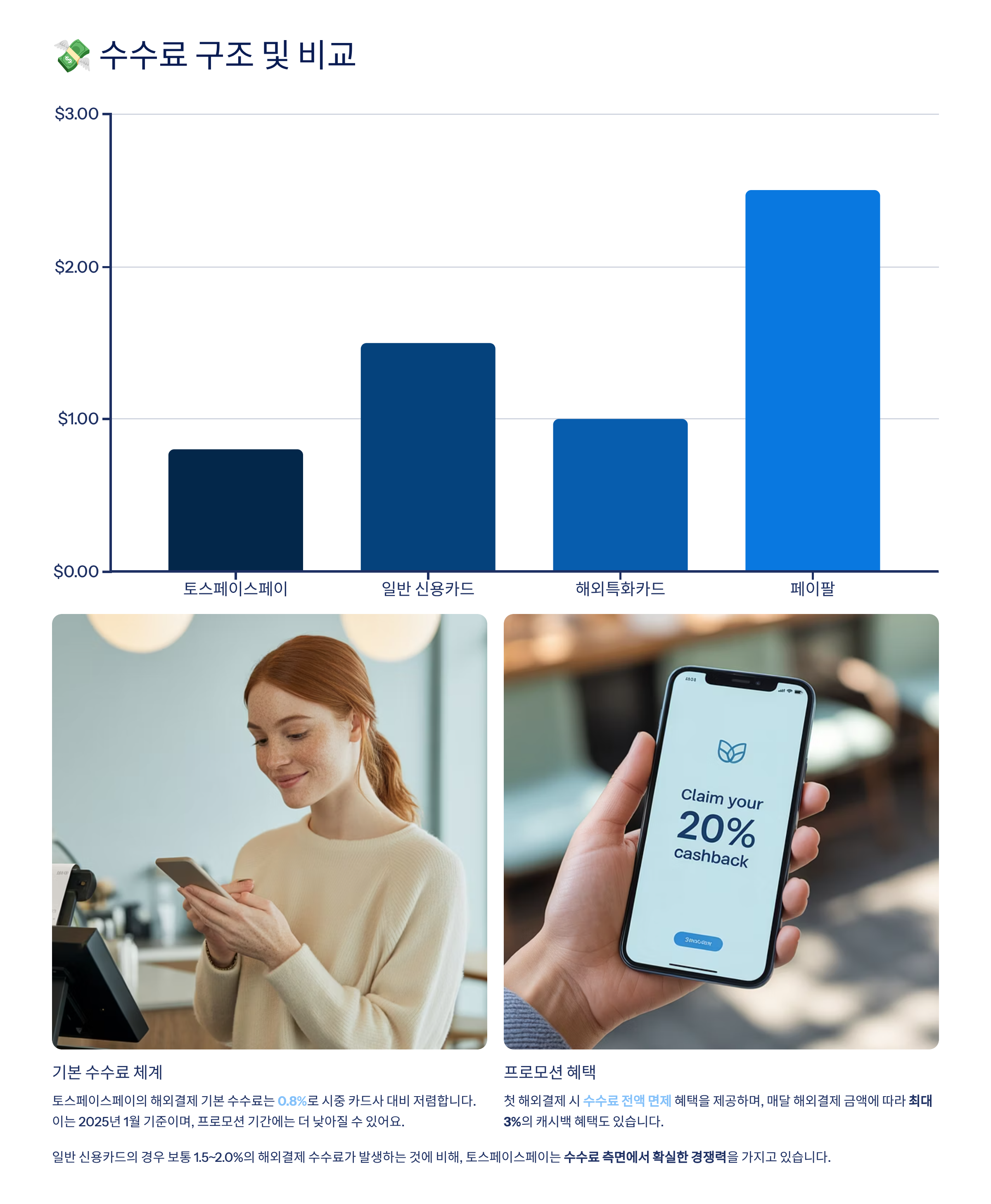 다른 카드사들의 해외 수수료는 보통 1.8~2.2%에 달하기 때문에, 토스페이스페이는 상대적으로 저렴한 구조라고 할 수 있어요. 특히 외화 잔고를 선충전해서 사용하면 토스 수수료는 거의 0%에 가까워져요.