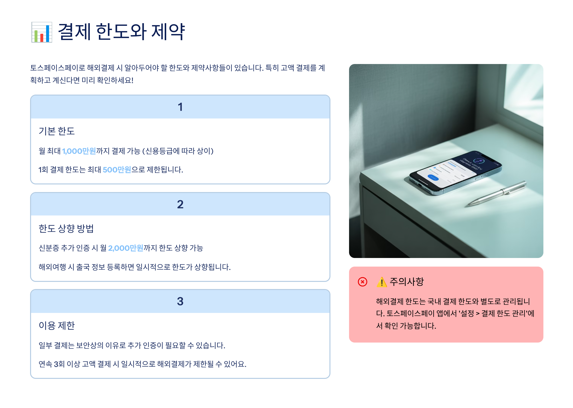 토스페이스페이의 해외결제 한도는 개인에 따라 다르게 설정돼요. 일반적으로 일일 최대 100만원까지 가능하고, 사용자의 등급이나 인증 정도에 따라 상향 조정도 가능해요.