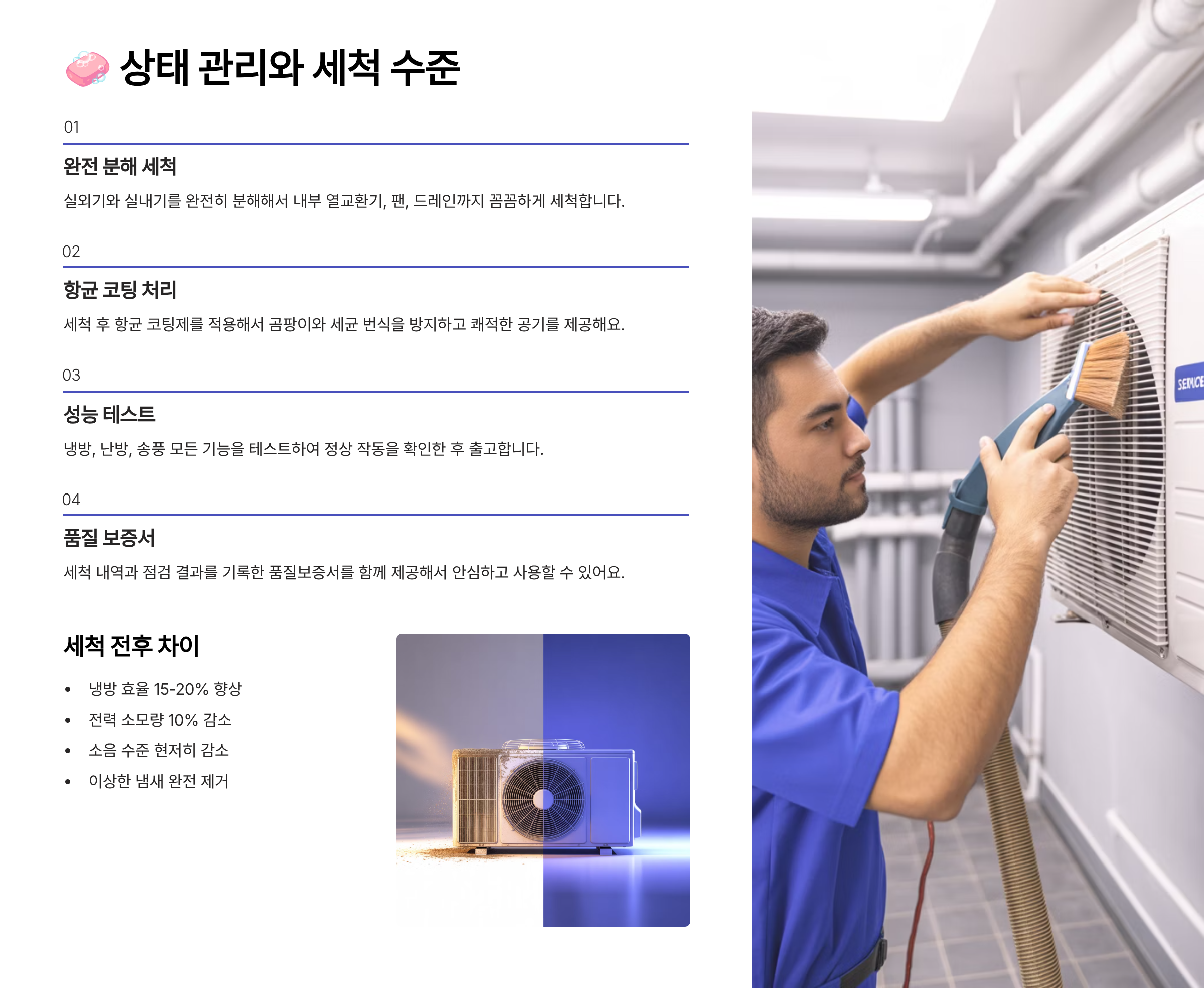 광명 지역에서 판매되는 제품 중 일부는 겉만 깨끗하게 정리한 채로 판매되지만, 전문 업체에서는 내부 팬, 열교환기, 필터까지 완벽하게 세척 후 항균 코팅까지 마무리해요. 이런 차이가 바로 가격 차이이자 만족도의 차이예요.