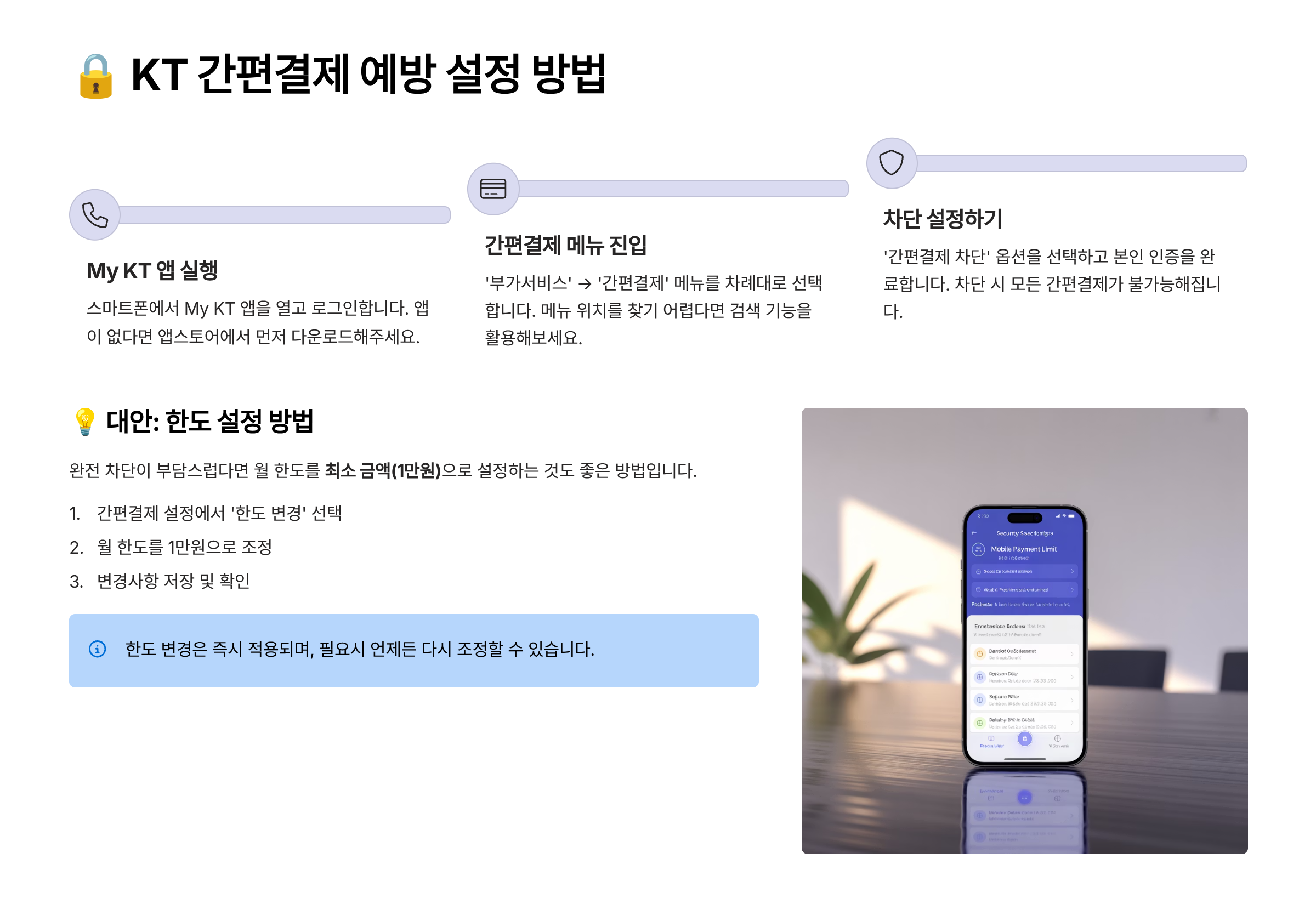 KT에서는 이런 피해를 예방할 수 있도록 간편결제 차단·한도 설정 같은 보안 기능을 제공해요. 미리 설정만 해둬도 결제 피해를 크게 줄일 수 있죠.