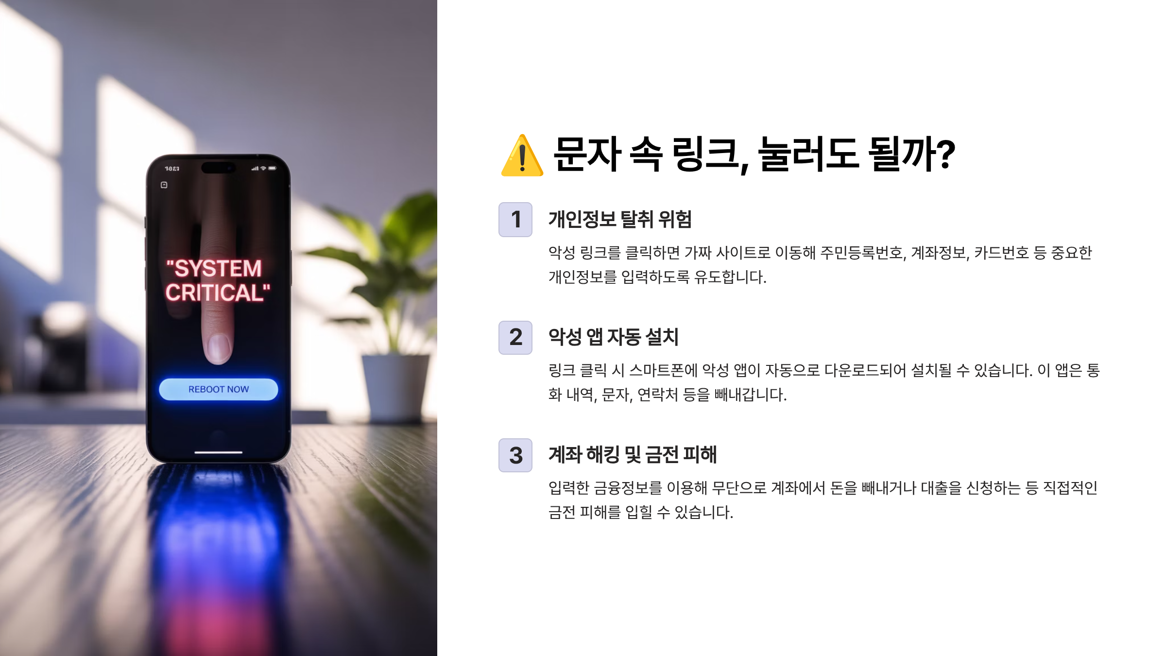 이런 문자, 클릭하면 어떻게 될까요? 바로 개인정보 유출, 계좌 해킹, 악성 앱 설치 등 심각한 피해로 이어질 수 있어요. 사기꾼들은 점점 교묘한 방법으로 국민을 속이고 있답니다 😡