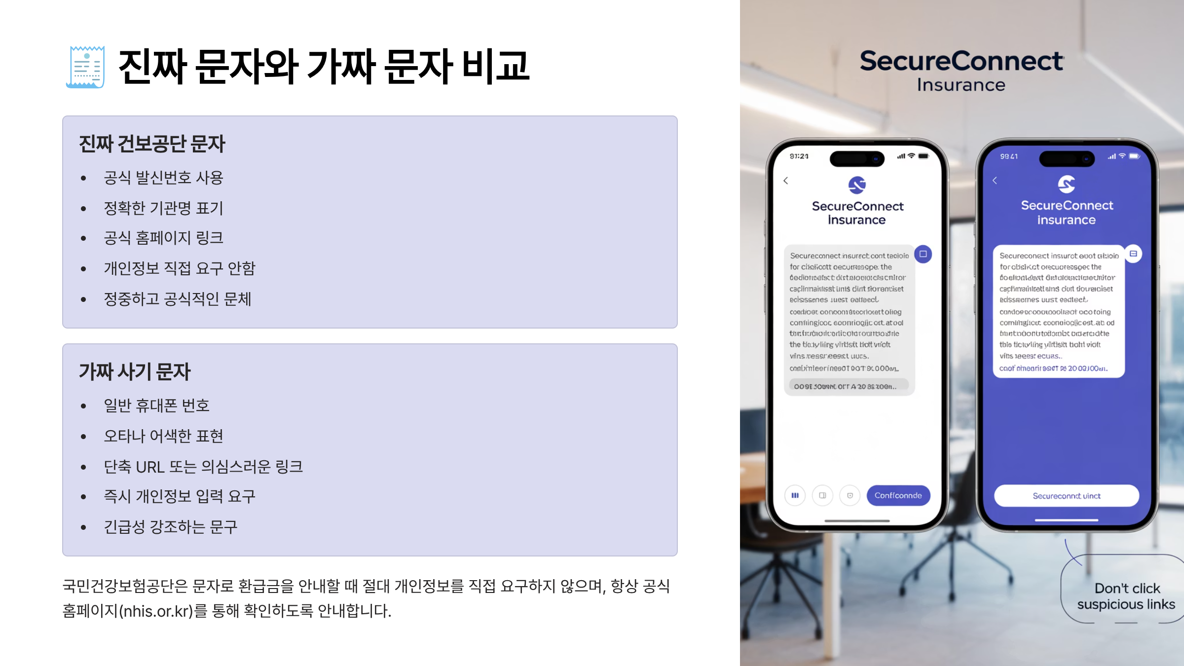 내가 생각했을 때, "국민건강보험이라면 믿을 수 있겠지" 하는 심리를 노리는 게 이들의 대표 전략이에요. 그래서 정확하게 진짜와 가짜를 구분하는 눈이 필요해요!