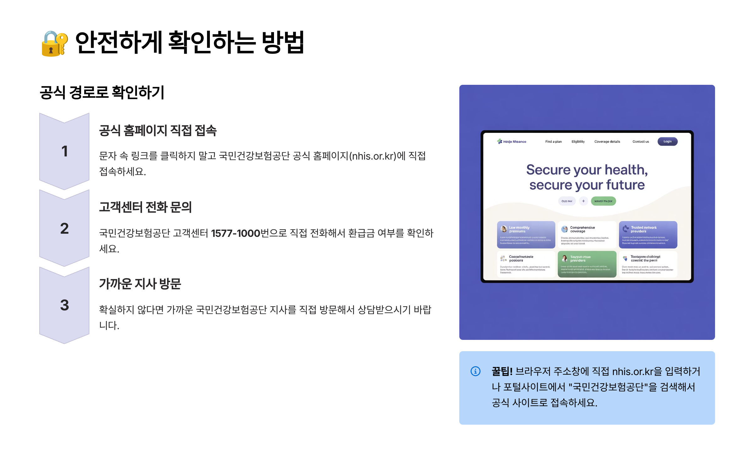 | 홈페이지 | nhis.or.kr 접속 → 환급금 조회 | 공식 정부 도메인만 사용 |