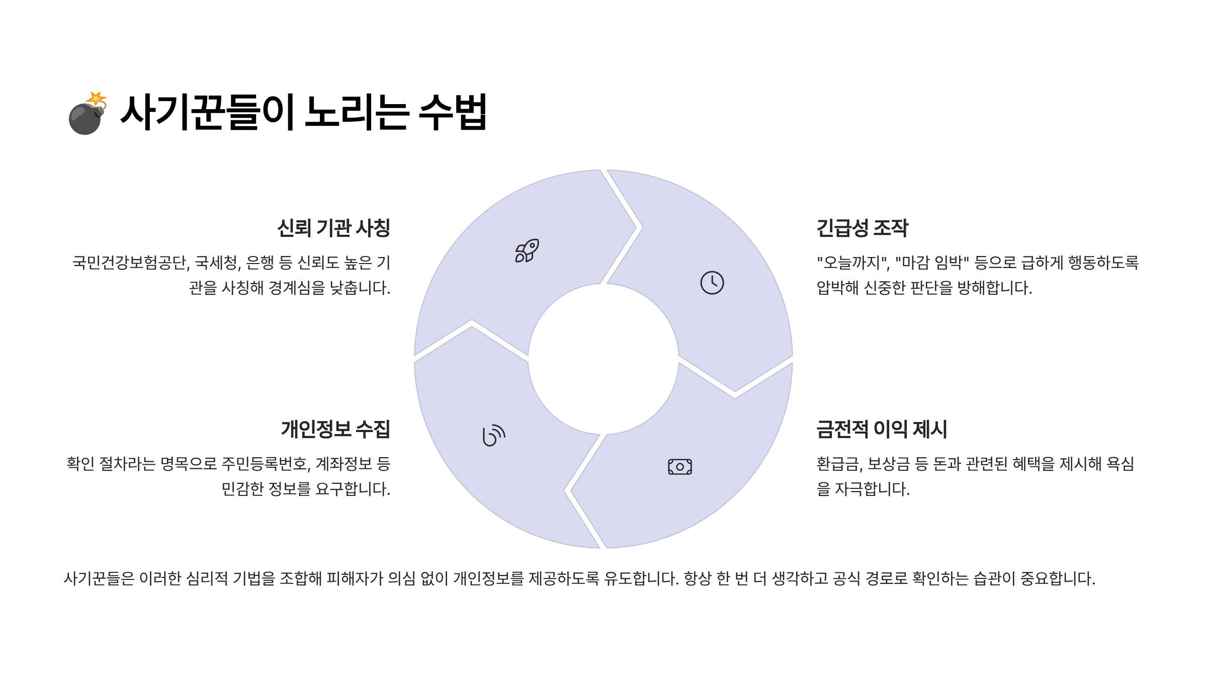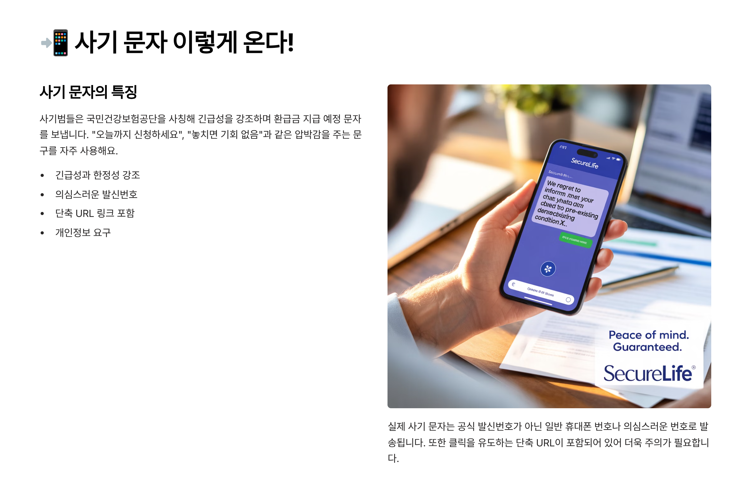 | 기관 사칭 | 공단, 국세청 등 신뢰 기관 이름 사용 |