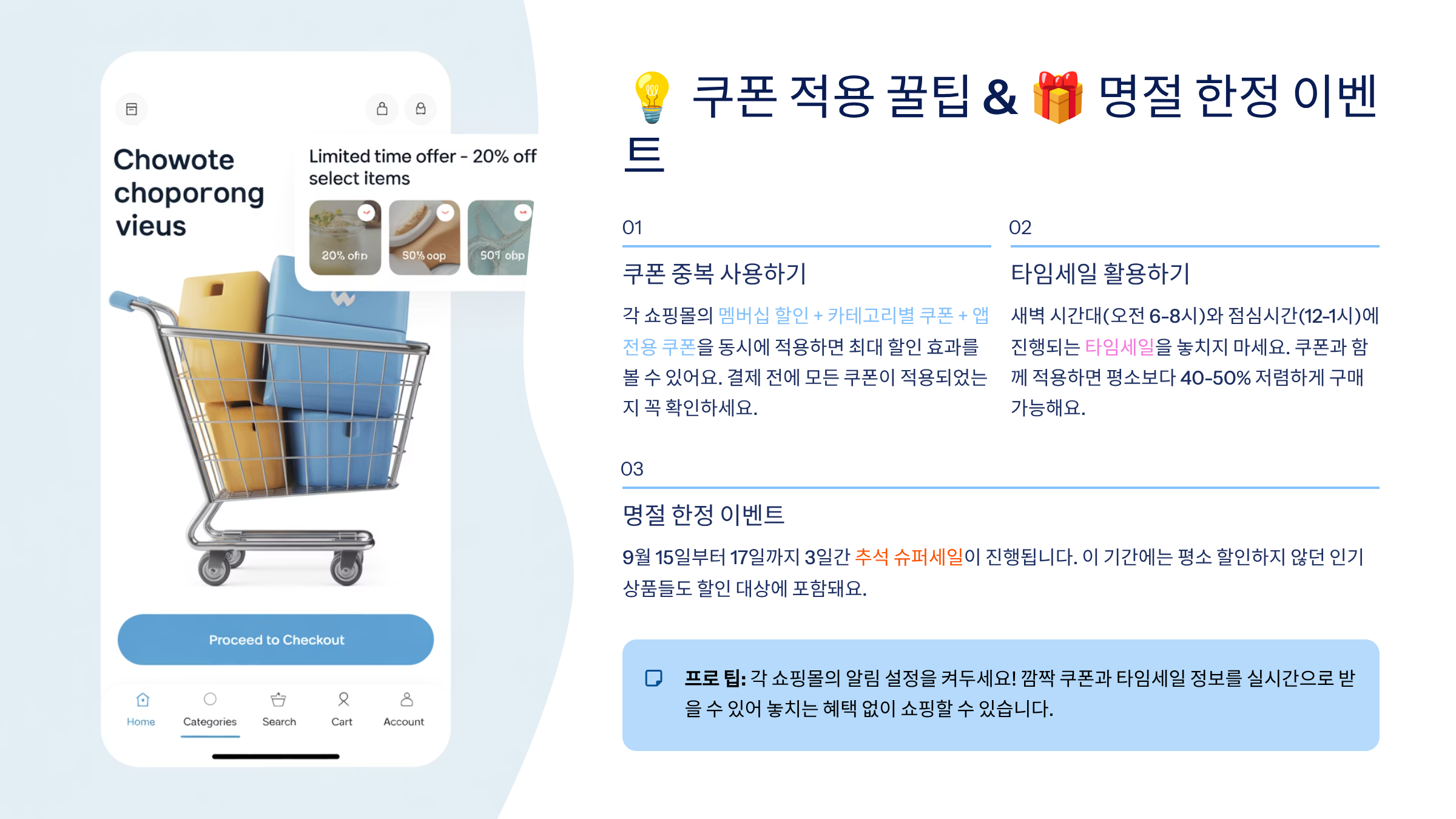 2025년 추석 시즌은 9월 12일부터 10월 6일까지 쿠폰 이벤트가 집중돼 있고, 일부 브랜드는 '하루 쿠폰', '타임딜 쿠폰', '앱 전용 쿠폰' 등 시간 제한형 쿠폰을 운영하고 있으니 미리 준비하면 좋아요!