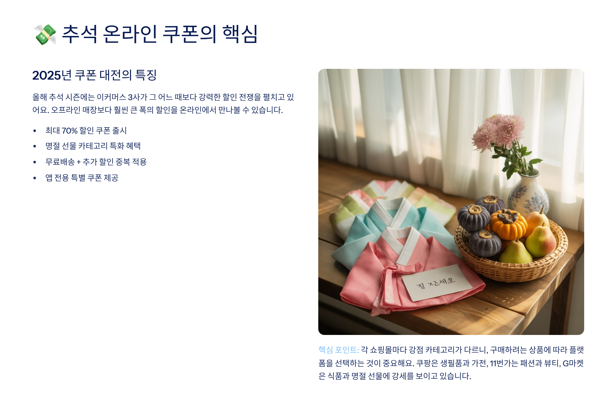 2025년에는 오프라인보다 온라인이 훨씬 강력해졌어요. 특히 추석 시즌엔 이커머스 3사가 ‘쿠폰 대전’을 펼치면서 고객 유치에 열을 올리고 있죠. 🧨
