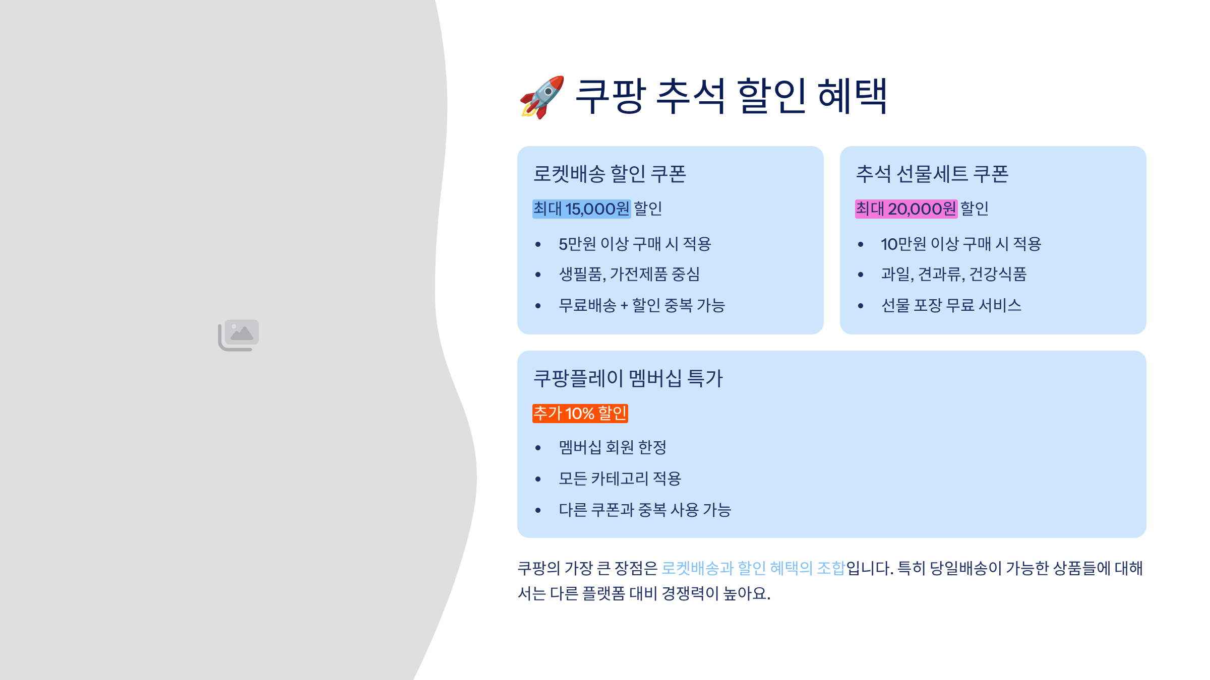 쿠팡은 로켓배송과 로켓프레시를 기반으로 ‘즉시할인형 쿠폰’과 ‘자동적용 할인’ 시스템을 운영하고 있어요. 특히 2025년 추석엔 식품·생활·가전·선물세트 카테고리에서 최대 30% 즉시할인을 적용하고 있어요.