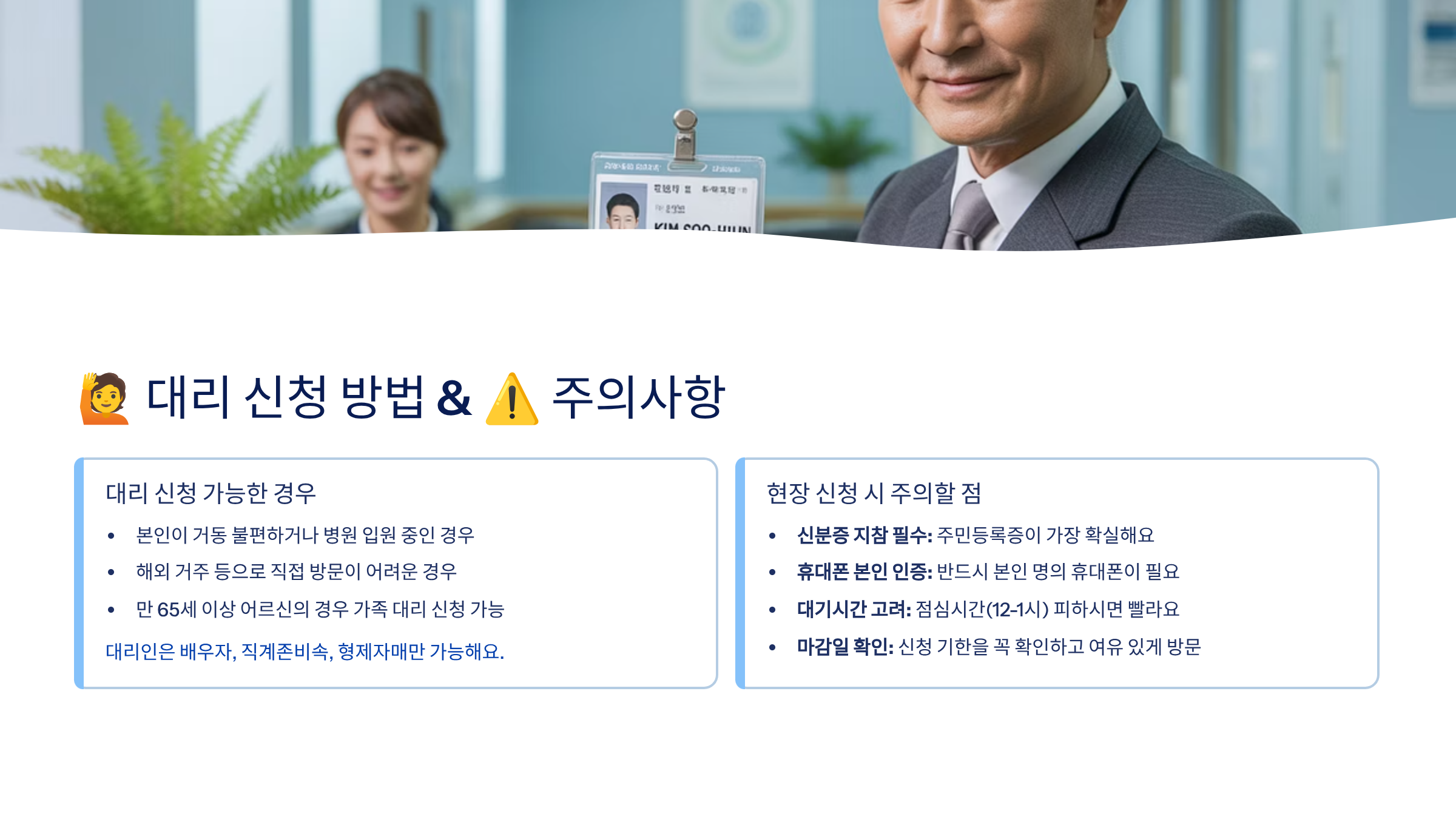 A7. 원칙적으로는 본인 방문이 원칙이지만, 대리 신청도 허용돼요.